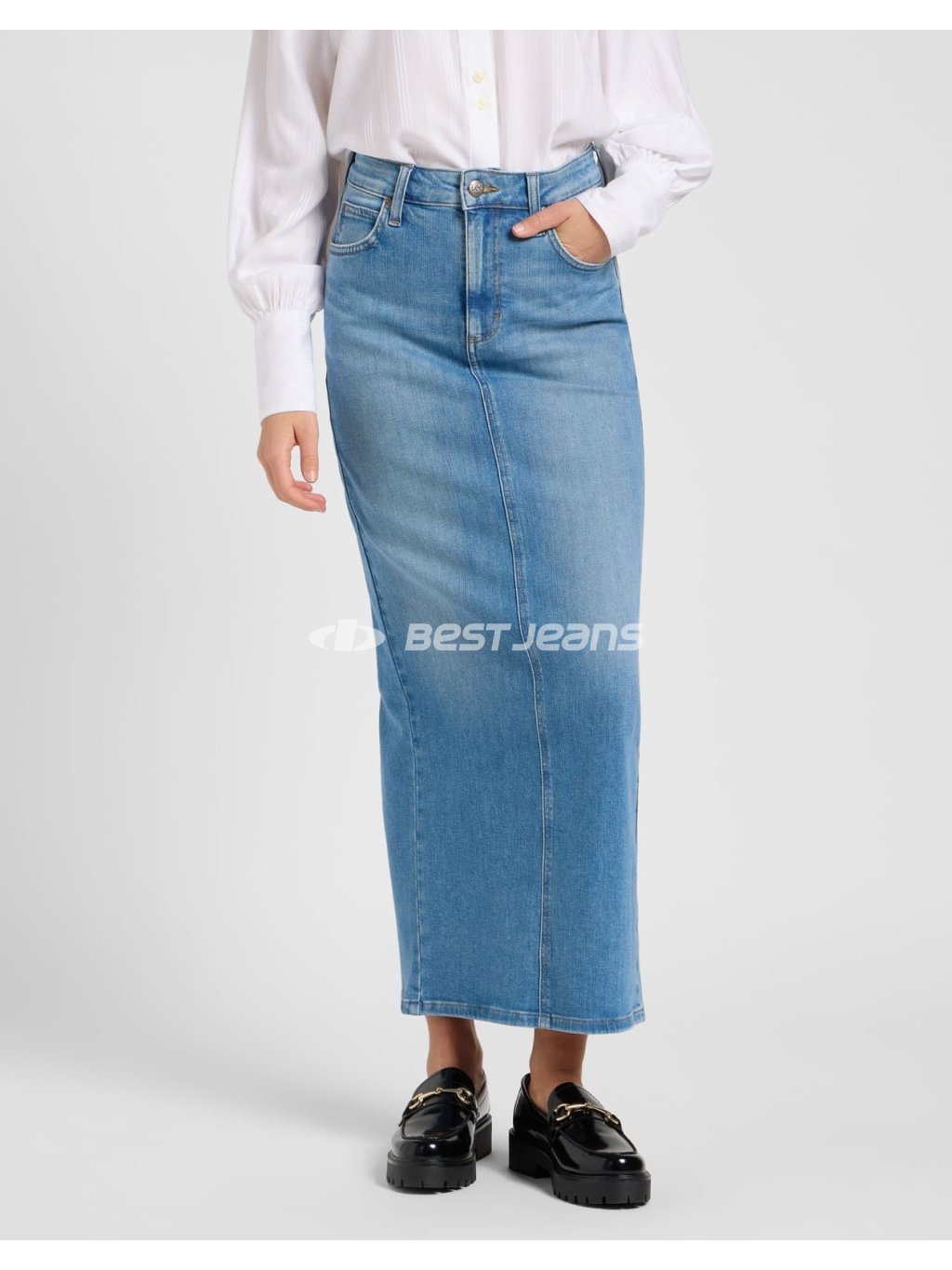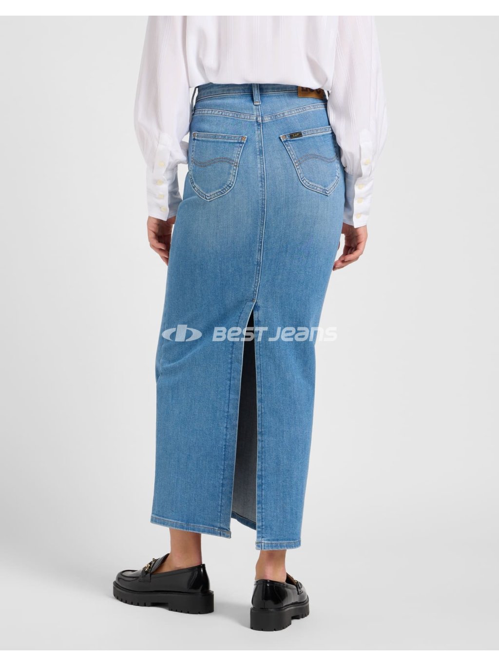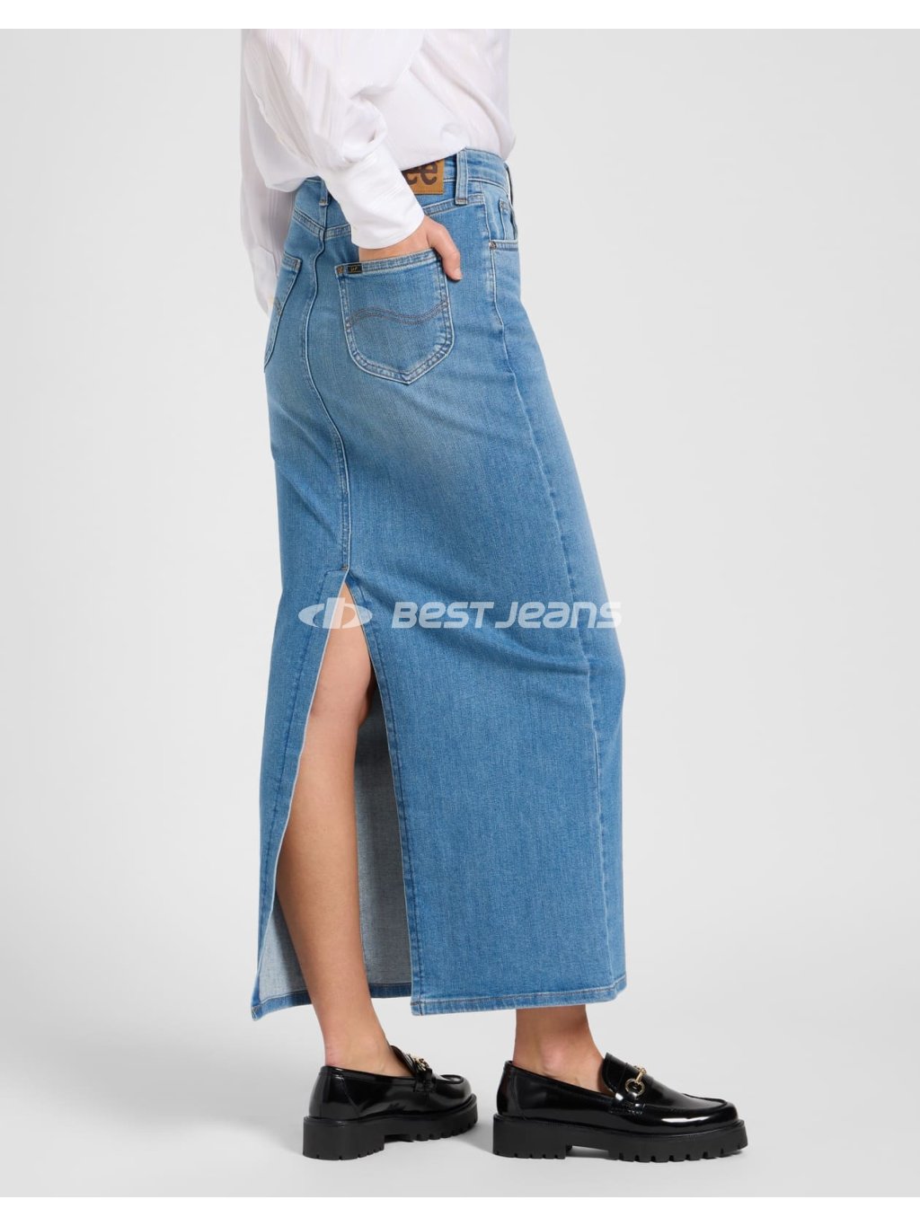 Dámská dlouhá džínová sukně Lee ke kotníkům z modrého denimu o střední gramáži. Díky příměsi elastomultiesteru a elastanu je pružná a příjemná při nošení. Rozparek vzadu.
