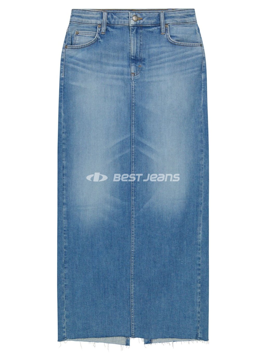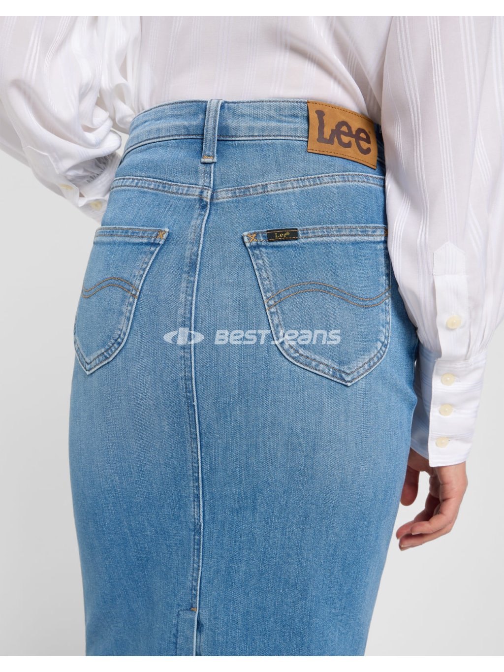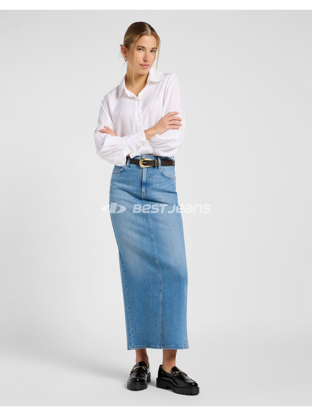 Dámská dlouhá džínová sukně Lee ke kotníkům z modrého denimu o střední gramáži. Díky příměsi elastomultiesteru a elastanu je pružná a příjemná při nošení. Rozparek vzadu.