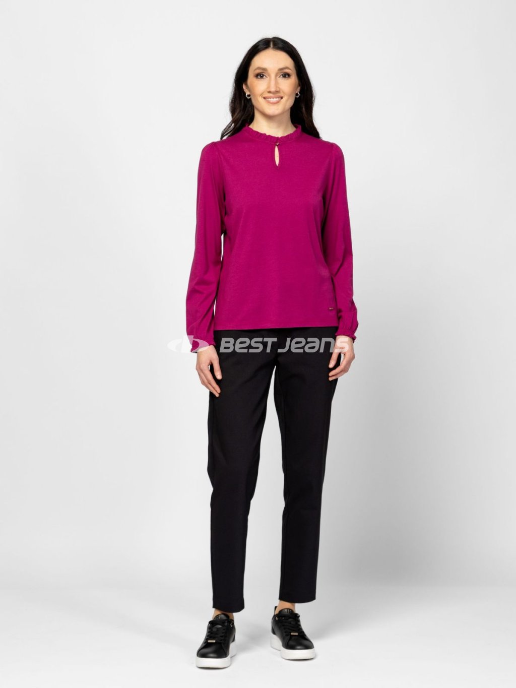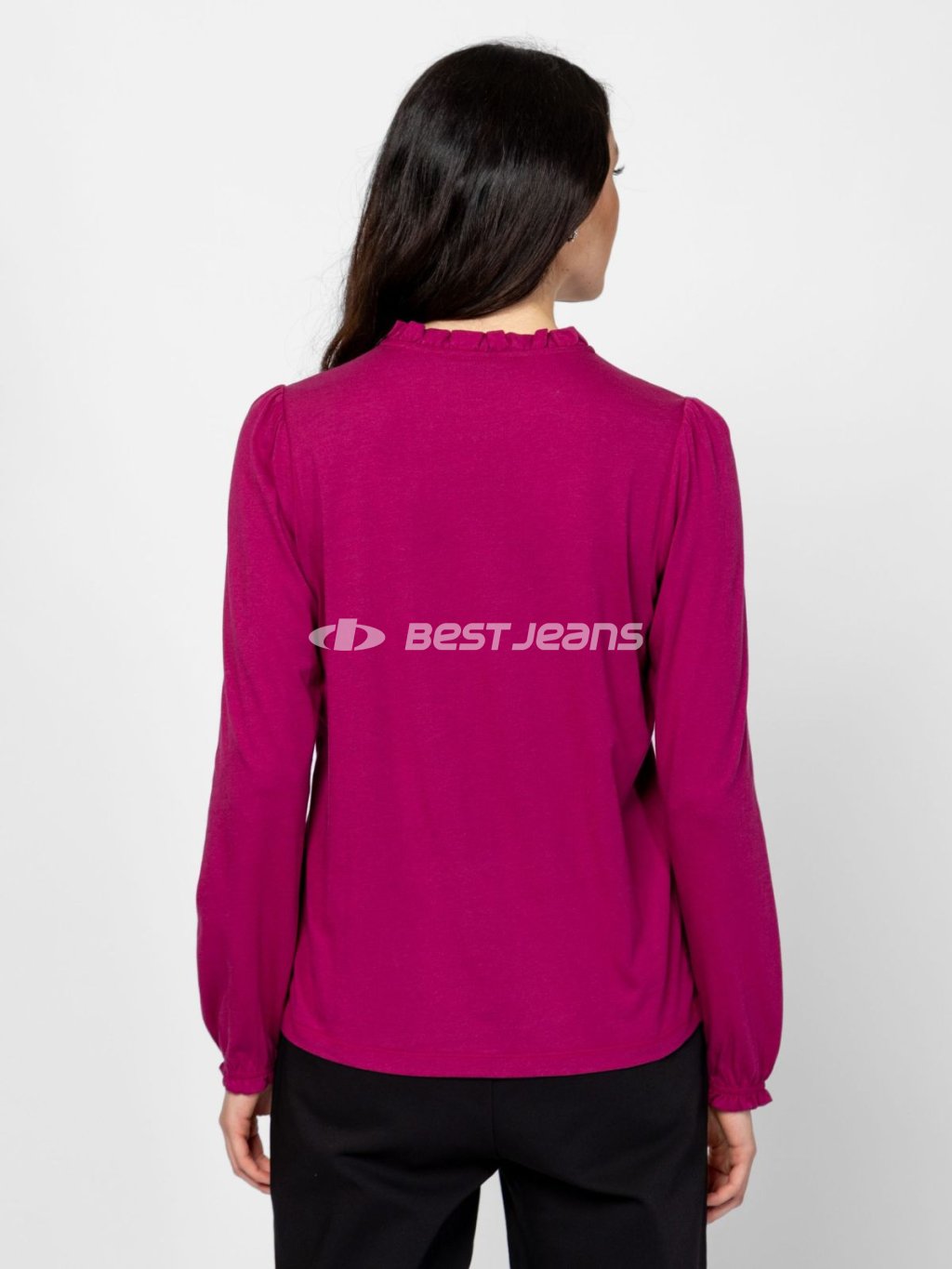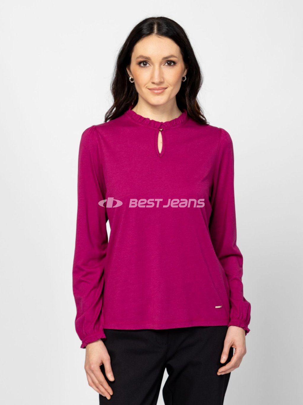 Dámská halenka/tričko Heavy Tools z lehké látky Single Jersey s dlouhými nabíranými rukávy s elastiským volánkovým zakončením a volánkovým límcem. Malé kovové logo na přední straně.