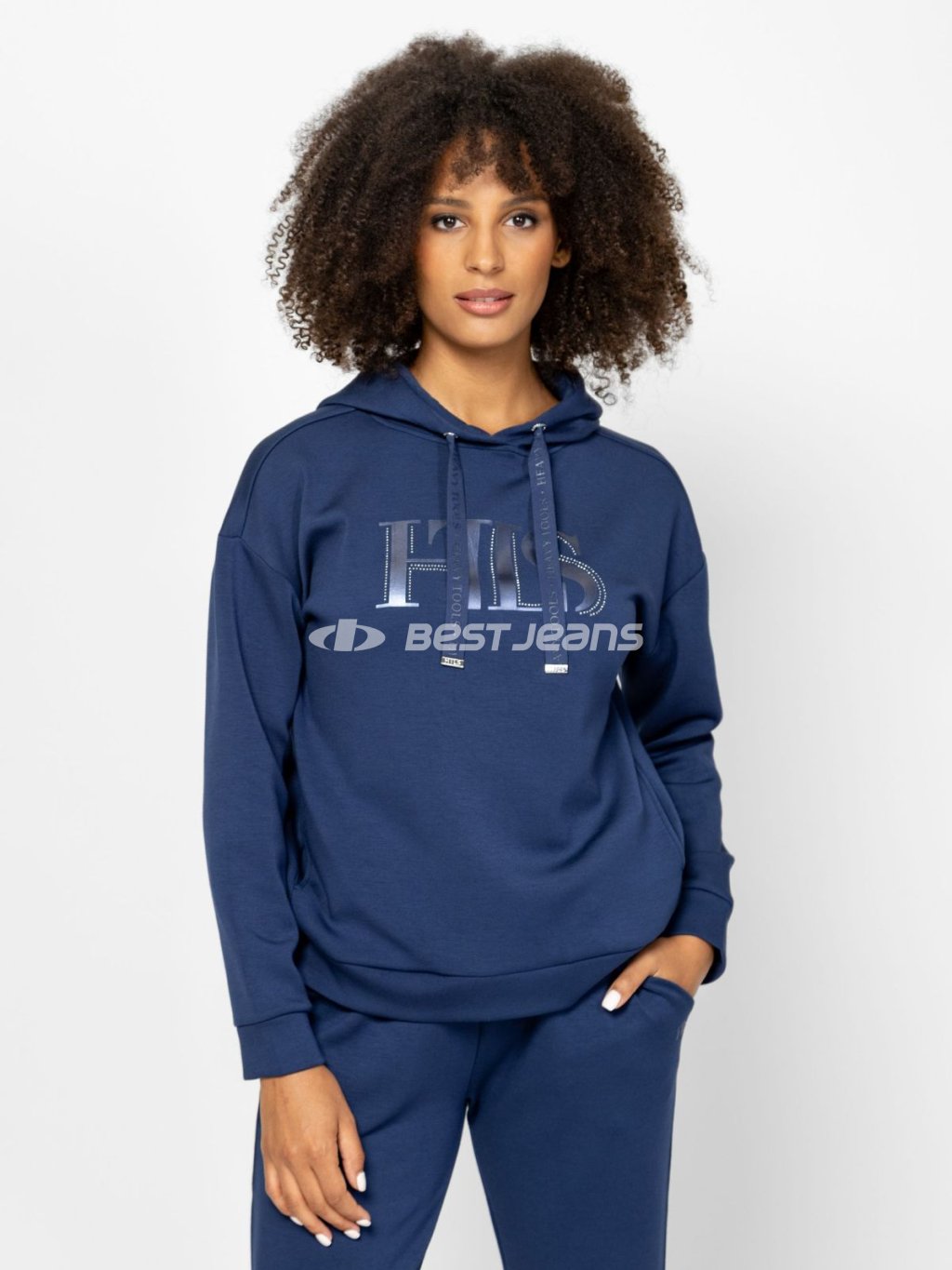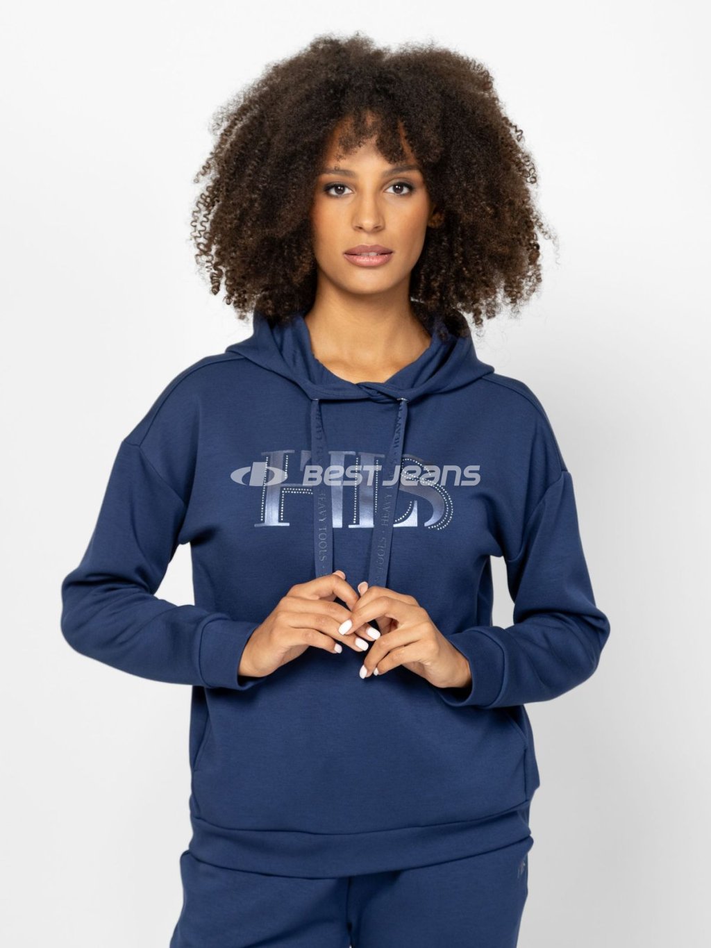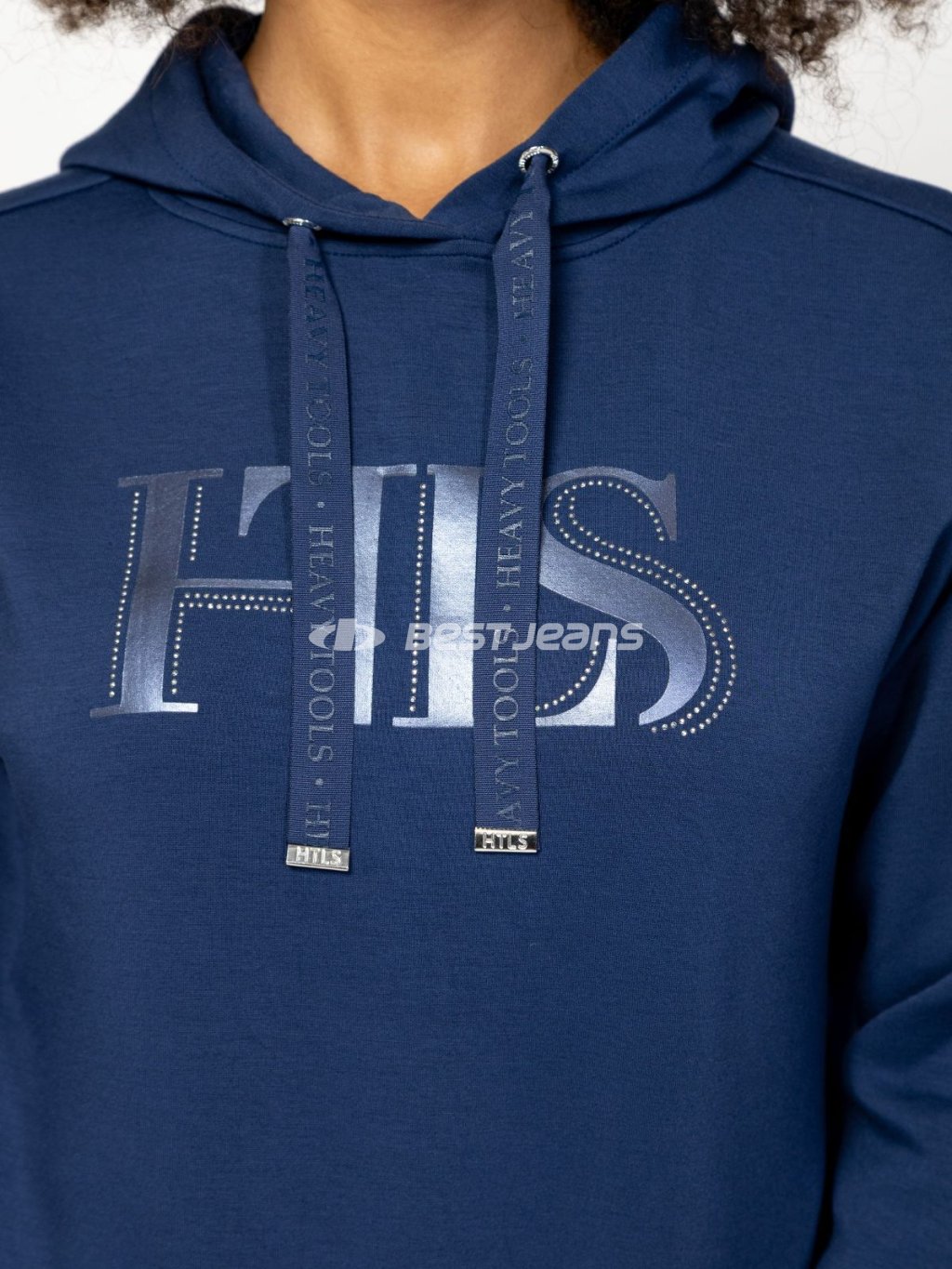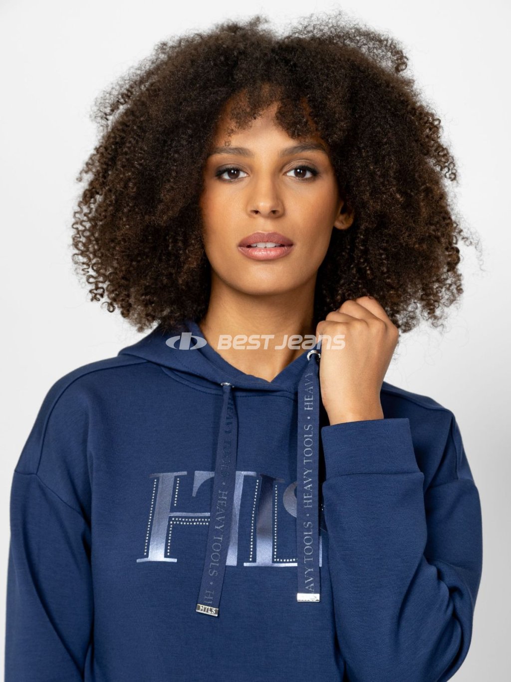 Dámská mikina Heavy Tools širšího střihu s nastavitelnou kapucí, spadlými rameny a větším potiskem loga v tónu na přední straně lemovaným drobnými kamínky. Velmi příjemný materiál.