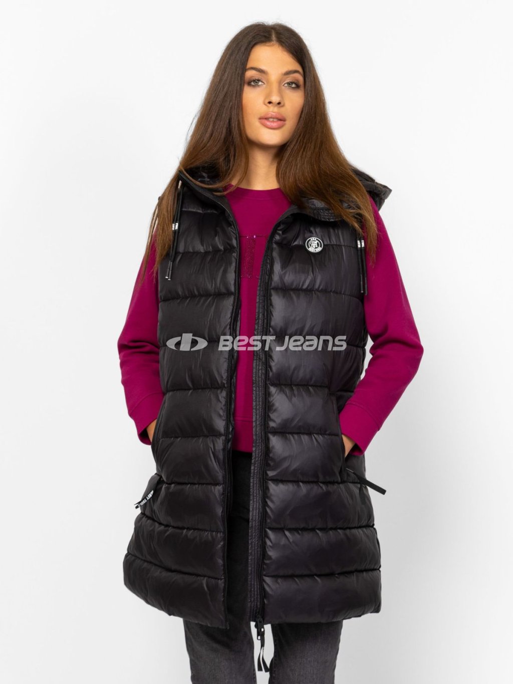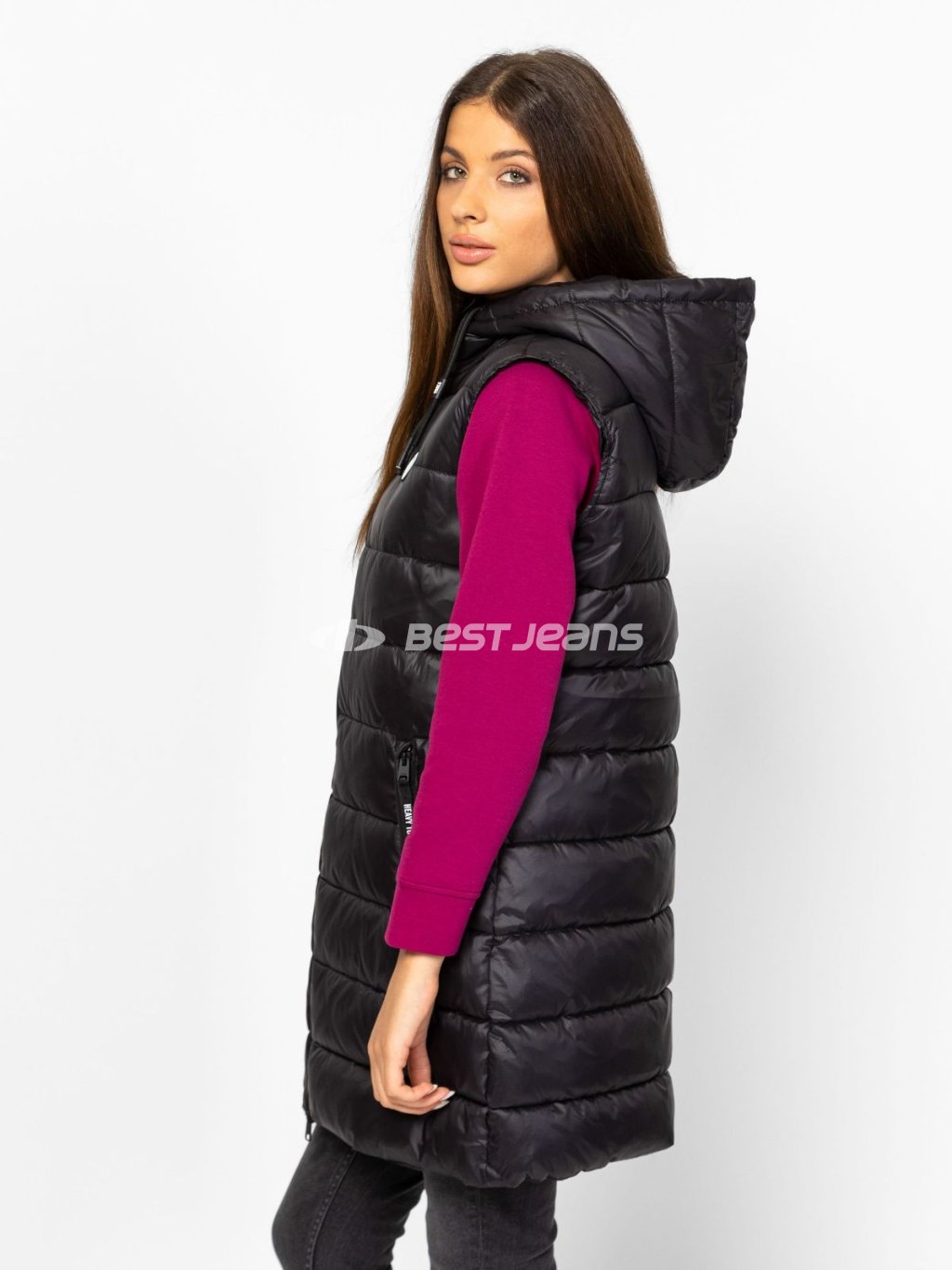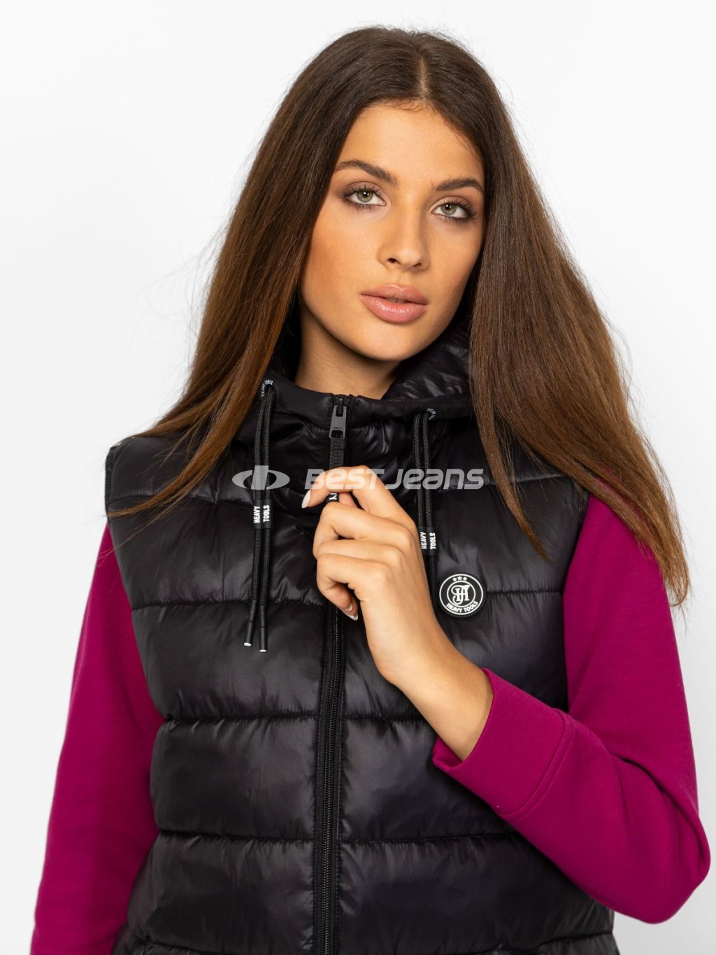 Dámská dlouhá prošívaná vesta Heavy Tools s kapucí a dvěma kapsami na zip. Mírně se rozšiřující střih, lightweight - lehká.