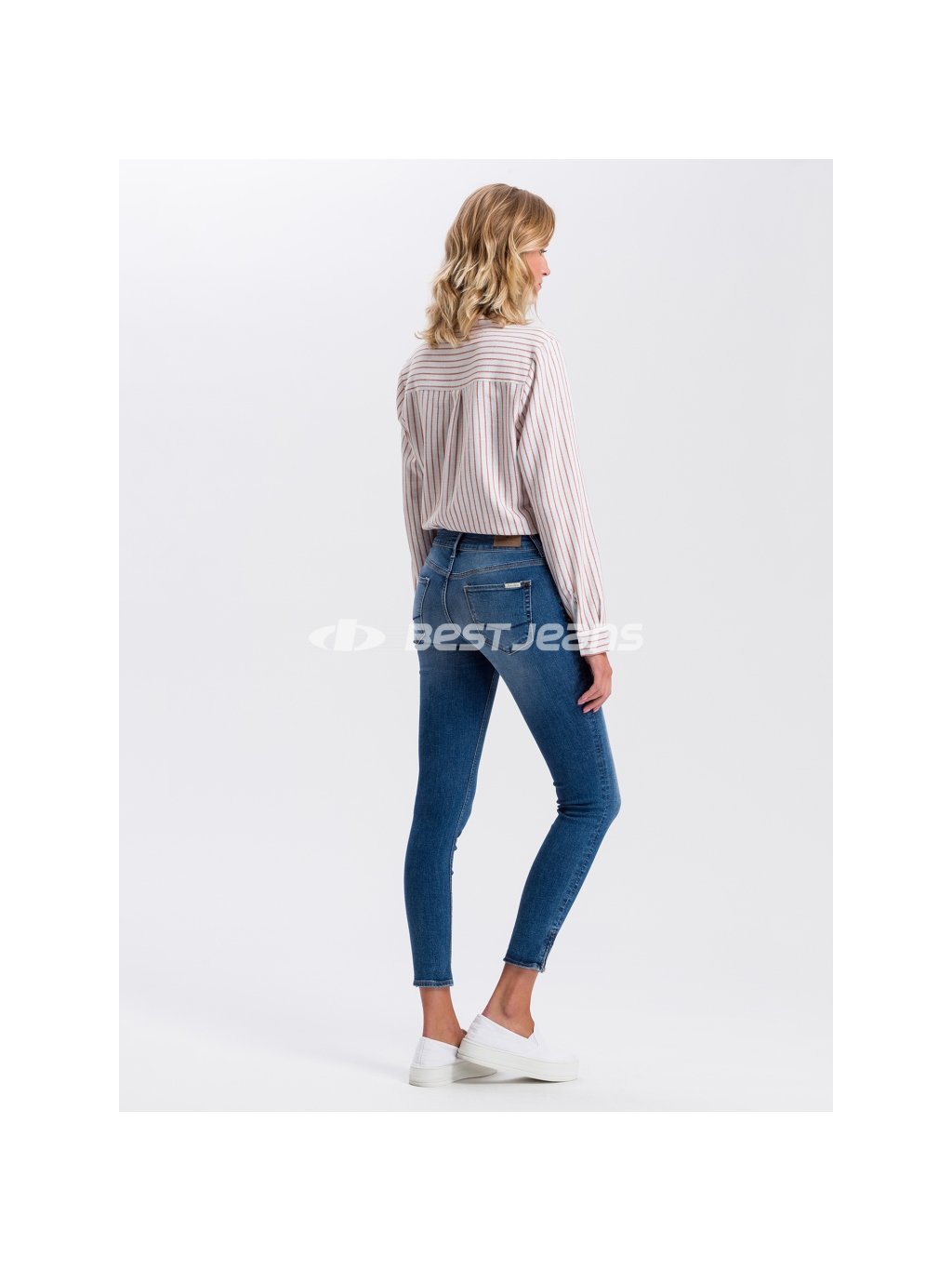 Dámské džíny Cross středního odstínu modré barvy s lehkým šoupáním v sedmiosminové délce střihu GISELLE. Tyto stylové jeans dokonale podtrhují ženské křivky a jsou oblíbené především díky úzkým, zcela přiléhavým nohavicím a středně vysokému pasu. Díky příměsi elastanu jsou kalhoty velmi pohodlné a příjemné.