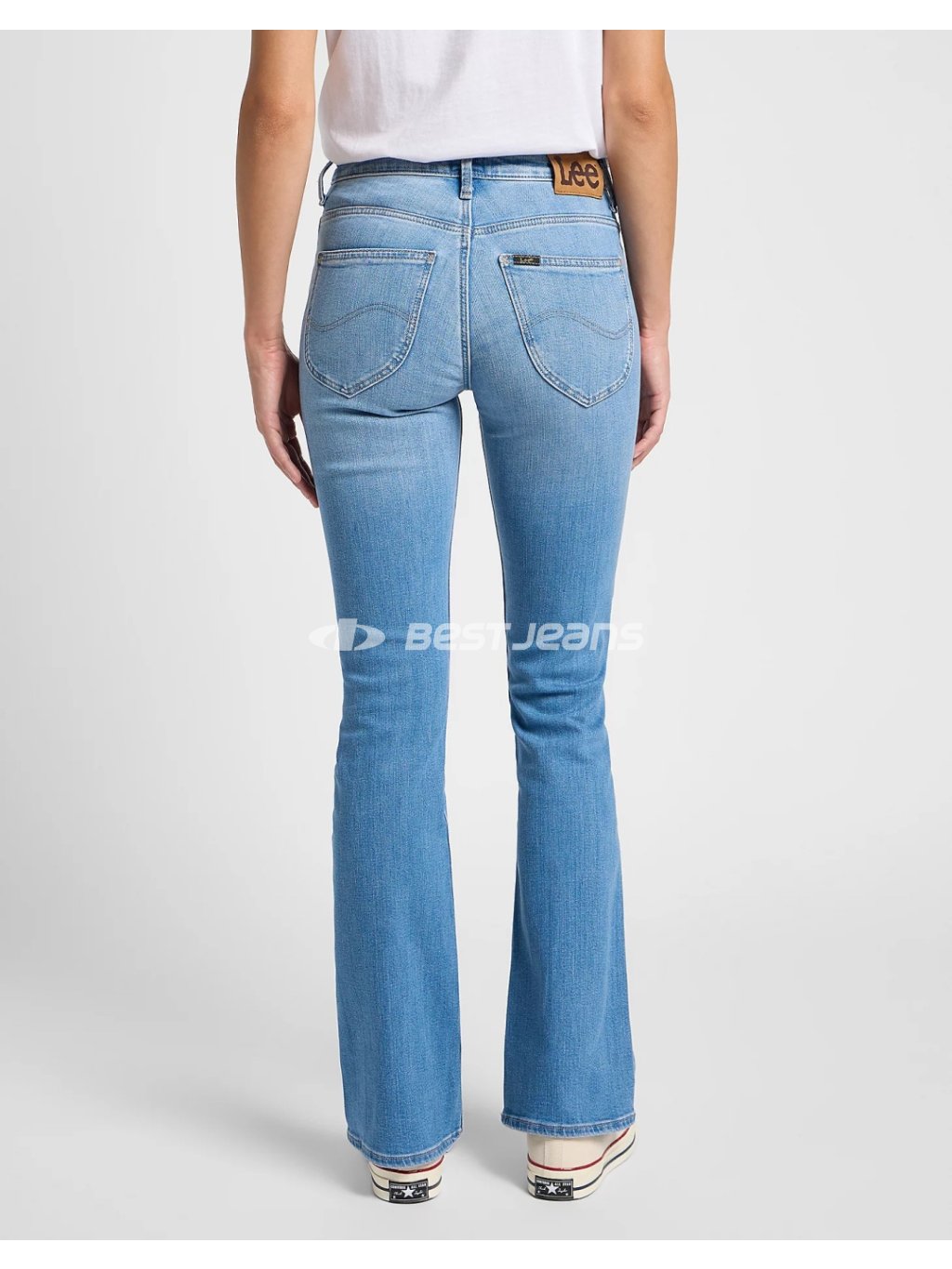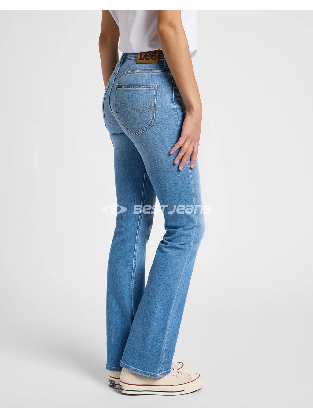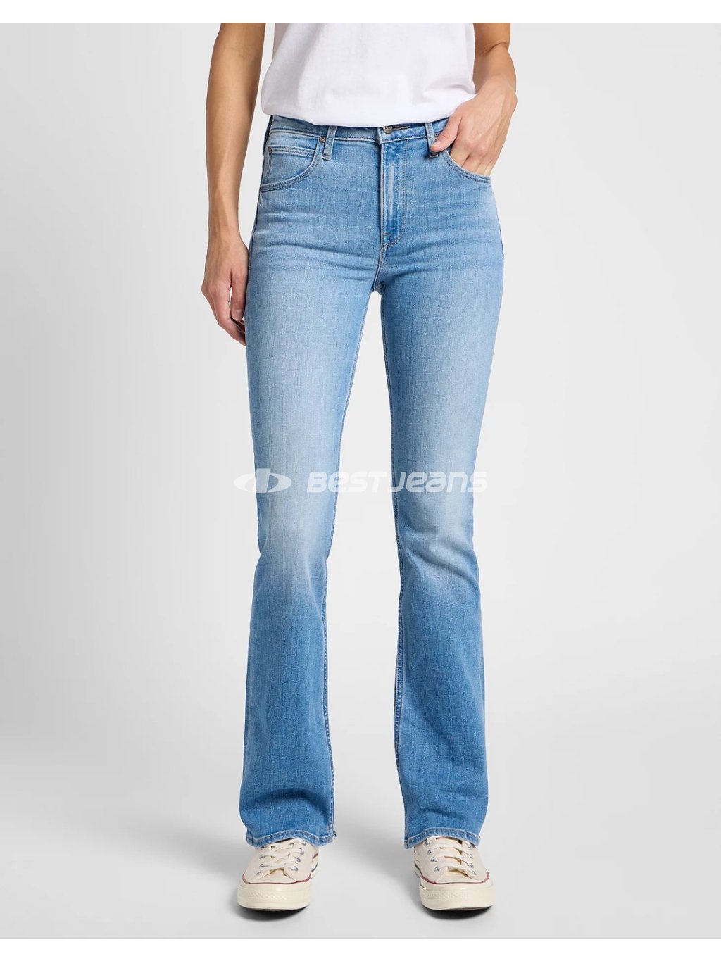 Stylové dámské džíny Lee do zvonu ve světlém až středním odstínu modré barvy s lehkým šoupáním. Materiál je ve střední gramáži. Tyto elegantní jeans jsou oblíbené především díky mírně se rozšiřujícím nohavicím a vysokému pasu.