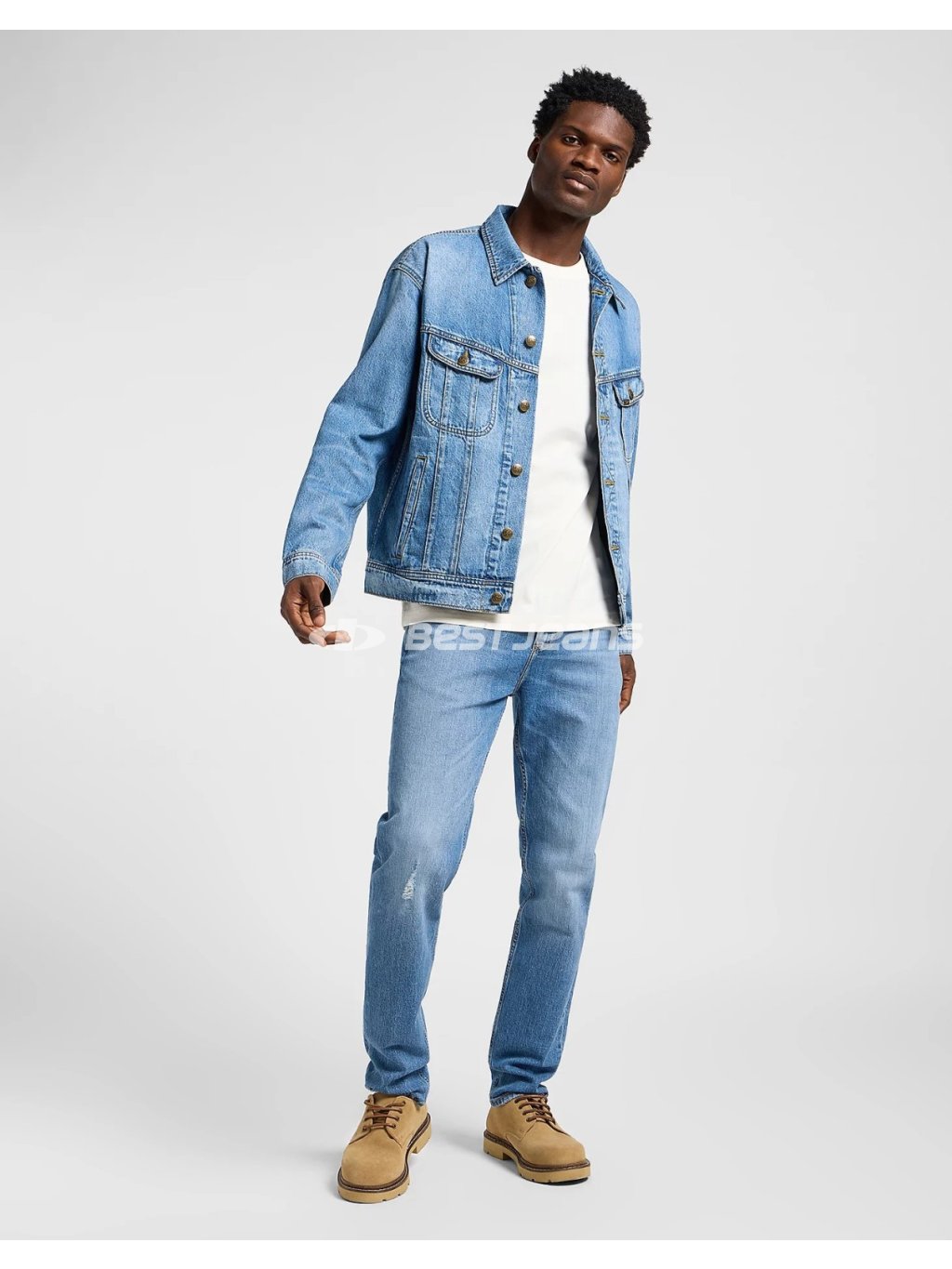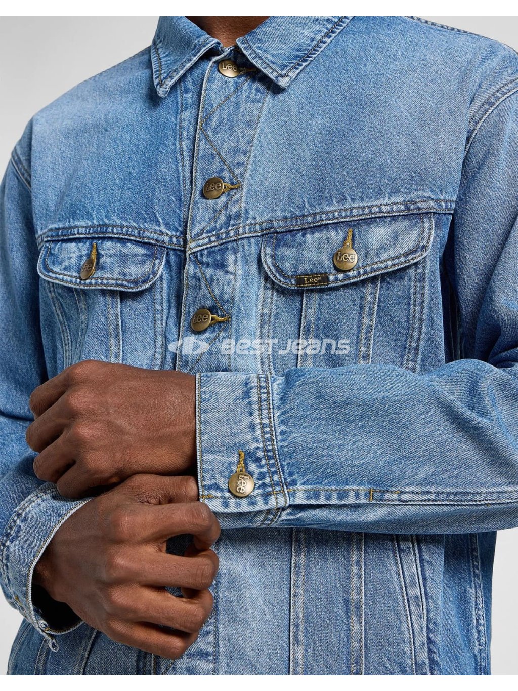 Kultovní pánská džínová bunda Lee Relaxed Rider ve světle až středně modré barvě se zapínáním na knoflíky. Značková jeans bunda je volného střihu a má dvě náprsní kapsy, které mají klopu uzavíratelnou na knoflík. Je prošitá oranžovou nití a na levé náprsní kapse najdeme menší černou textilní nášivku se značkou Lee. Džíska je z kvalitního odlehčeného denimu.
