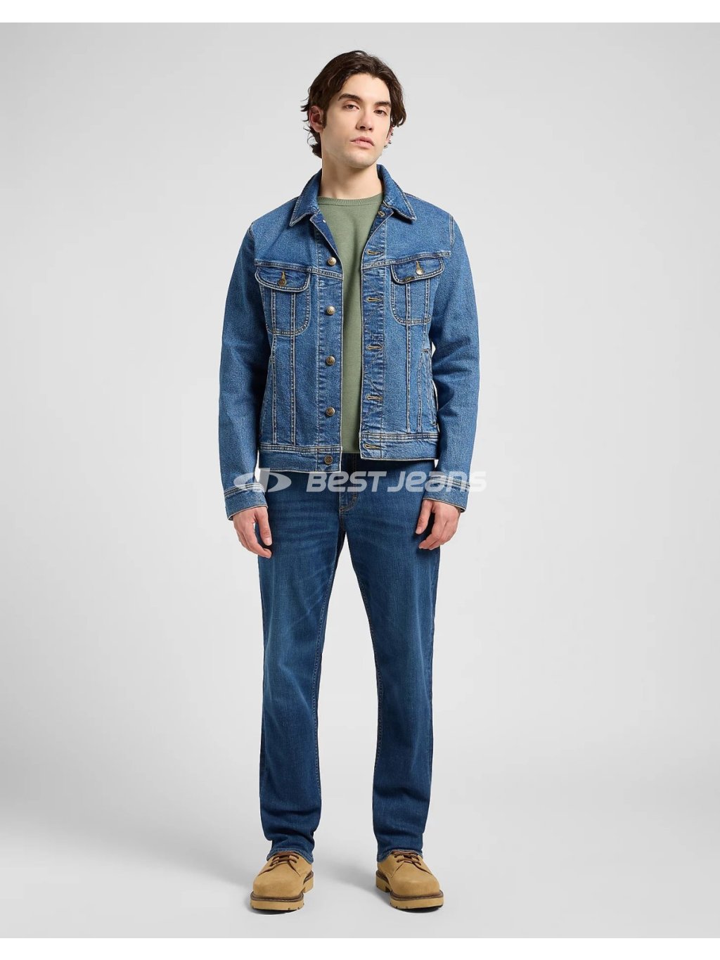 Tato jeans bunda je ze středně modrého denimu a má zapínání na knoflíky. Je prošitá oranžovou nití a na levé náprsní kapse najdeme menší černou textilní nášivku se značkou Lee. Džíska je z kvalitního pružného materiálu s příměsí elastanu, který umožňuje neomezený pohyb.