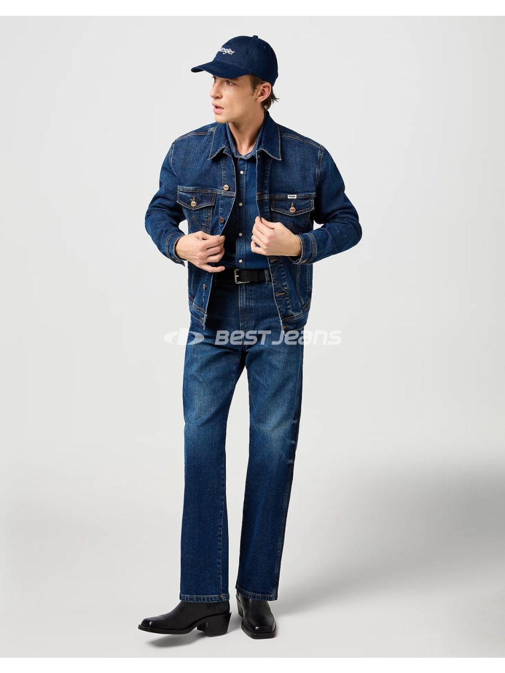 Klasická pánská tmavě modrá džínová bunda Wrangler se zapínáním na knoflíky. Bunda má dvě volně přístupné kapsy, dvě kapsy náprsní, které mají klopu uzavíratelnou na knoflík, a dělené kapsy zevnitř. Je prošitá oranžovou nití, náprsní kapsy jsou prošity typickým ozdobným stehem ve tvaru písmene W. Nad levou náprsní kapsou najdeme menší bílou textilní nášivku se značkou Wrangler. Džíska je z kvalitního příjemného a lehce pružného denimu.