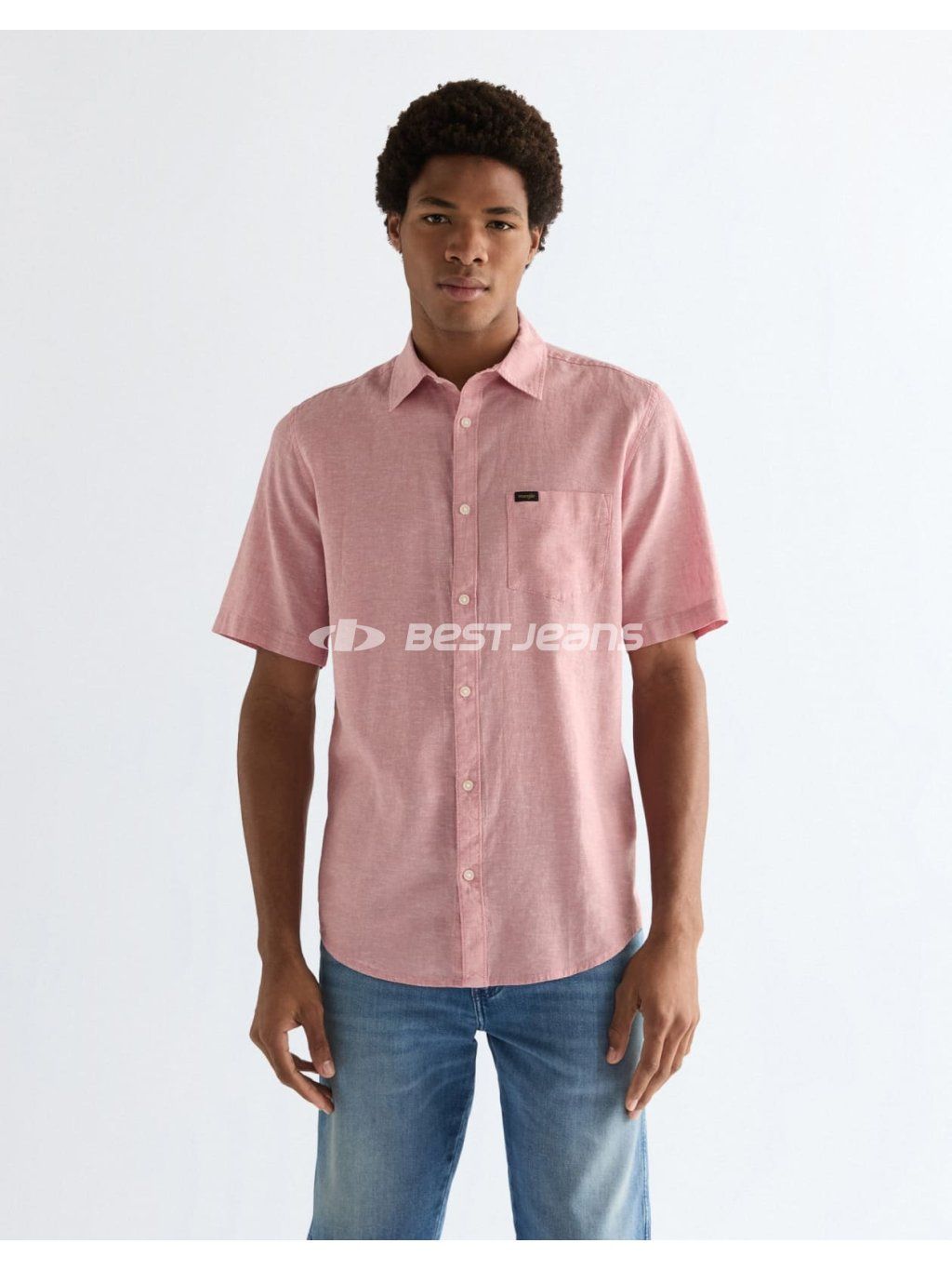 Pánská košile Wrangler s krátkými rukávy, jednou kapsičkou a zapínáním na knoflíky. Látka nádherné růžové barvy v plátnové vazbě.