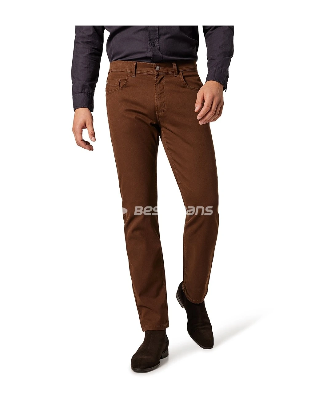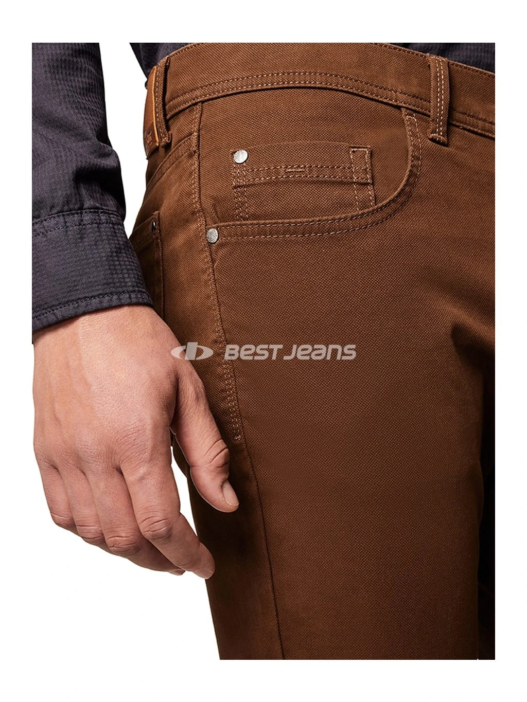 Elegantní pánské kalhoty klasického střihu RANDO se středním, vzadu mírně vyšším sedem a rovnými nohavicemi. Jsou vyrobeny z příjemné světle hnědé látky, prošity nití v tónu včetně originálního ozdobného prošití zadních kapes a mají mosazné nýty a knoflík s logem značky. Vzadu na pasu nechybí nášivka PIONEER AUTHENTIC JEANS. Použitý materiál MEGAFLEX s příměsí elastanu je pružný a pohodlný.