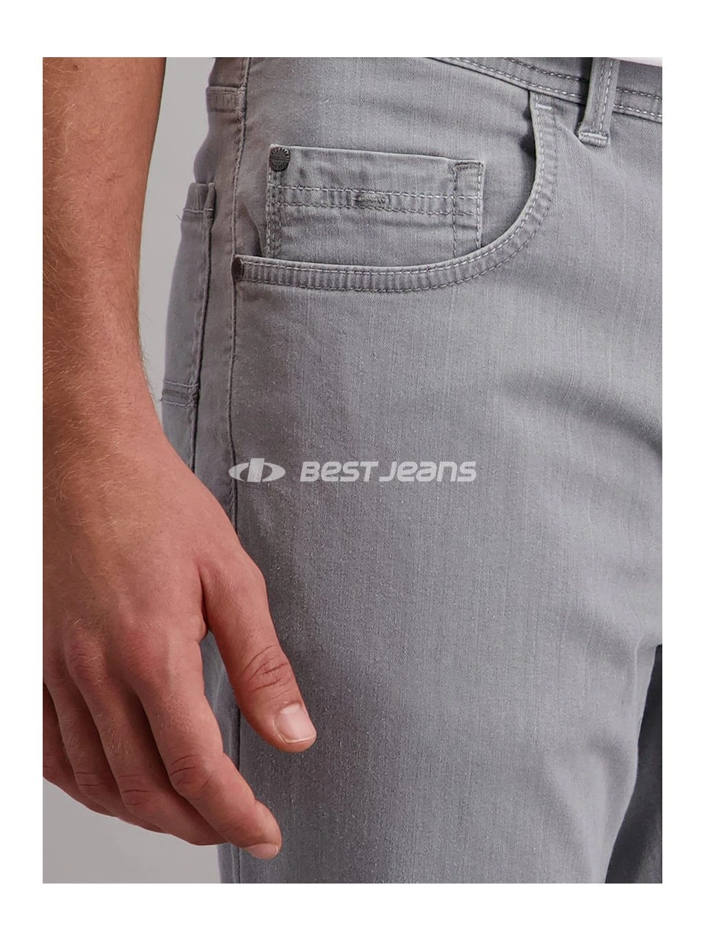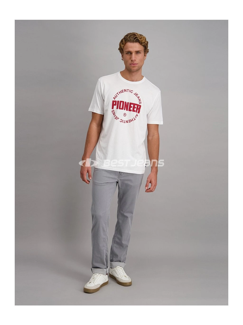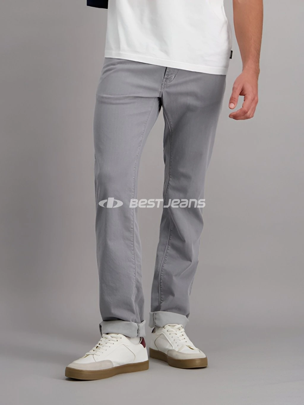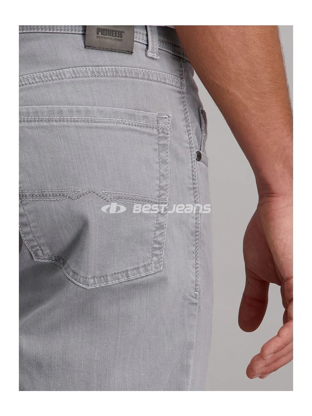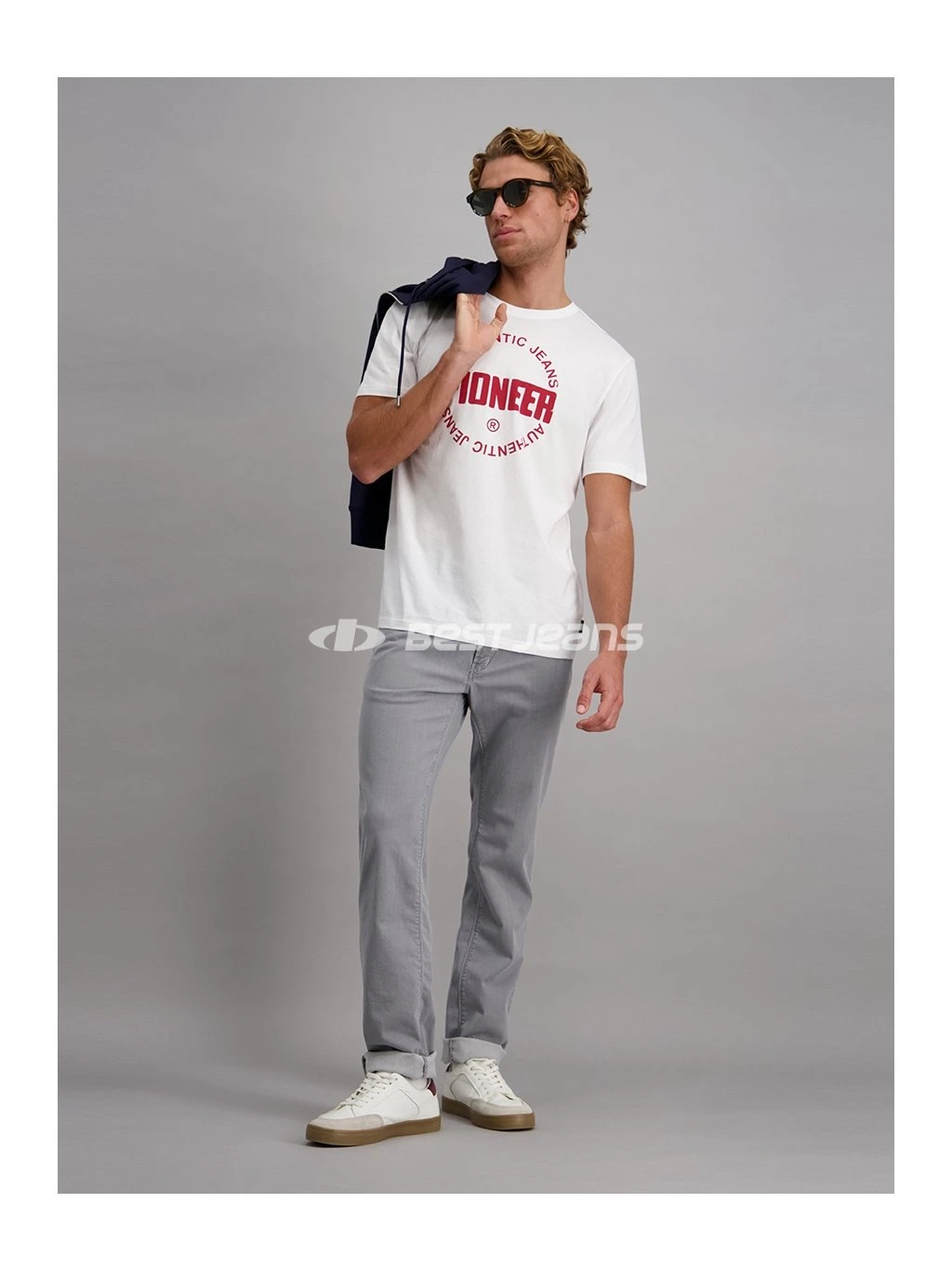 Elegantní lehké pánské kalhoty klasického střihu RANDO se středním, vzadu mírně vyšším sedem a rovnými nohavicemi. Díky použitému materiálu MEGAFLEX s příměsí elastanu jsou pružné a pohodlné při nošení. Jsou vyrobeny z velmi příjemné světle šedé látky a prošity nití v šedém tónu včetně originálního ozdobného prošití zadních kapes. Vzadu na pasu nechybí kožená nášivka PIONEER AUTHENTIC JEANS.