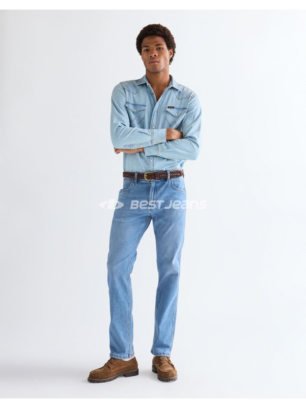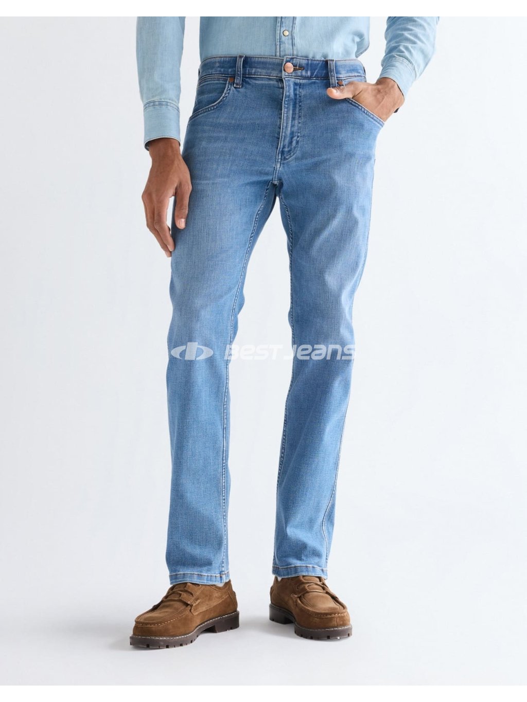 Moderní džíny rovného střihu se středním, vepředu nízkým pasem a mírně se zužujícími nohavicemi. Kalhoty jsou vyrobeny z příjemného, vysoce pružného denimu Free to Stretch světle modré barvy o střední gramáži. Jsou prošity oranžovou nití a mají mosazné nýty a knoflík. Na zadních kapsách jeans je ozdobné originální „W“ vyšívání, na pravé zadní kapse také kožená nášivka s logem Wrangler.