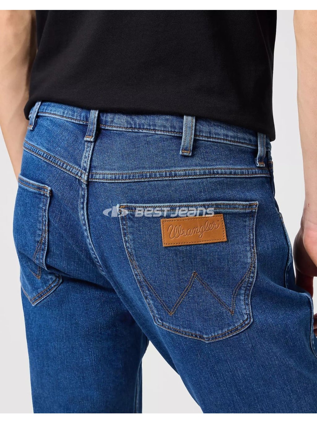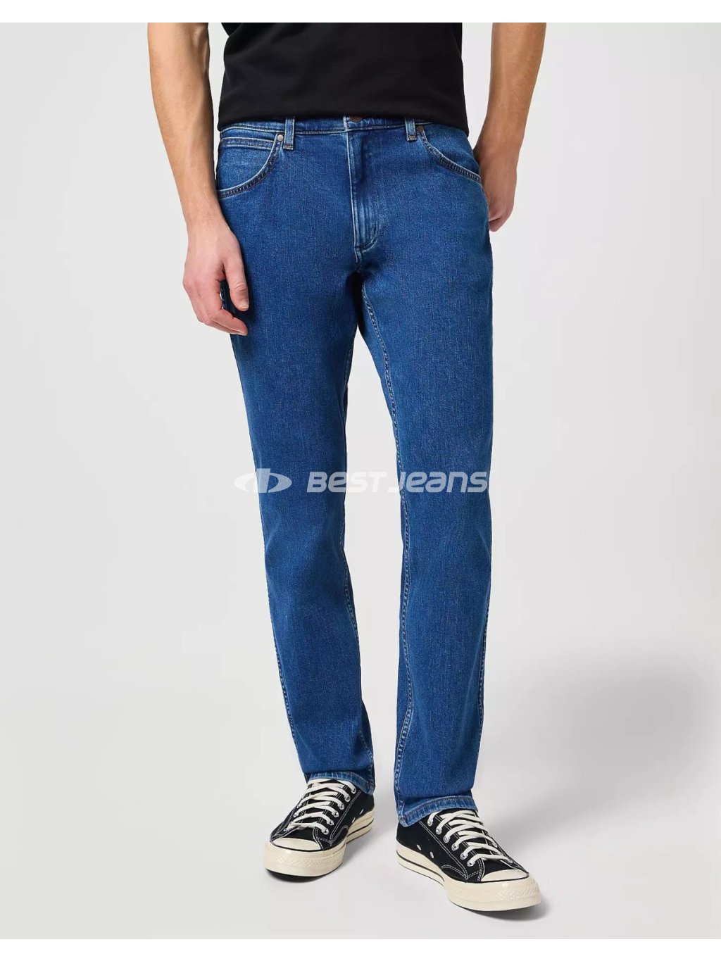 Moderní džíny rovného střihu se středním, vepředu nízkým pasem a mírně se zužujícími nohavicemi. Kalhoty jsou vyrobeny z příjemného středně modrého denimu o střední gramáži. Jsou prošity světle hnědou nití a mají mosazné nýty a knoflík. Na zadních kapsách jeans je ozdobné originální „W“ vyšívání, na pravé zadní kapse také kožená nášivka s logem Wrangler.