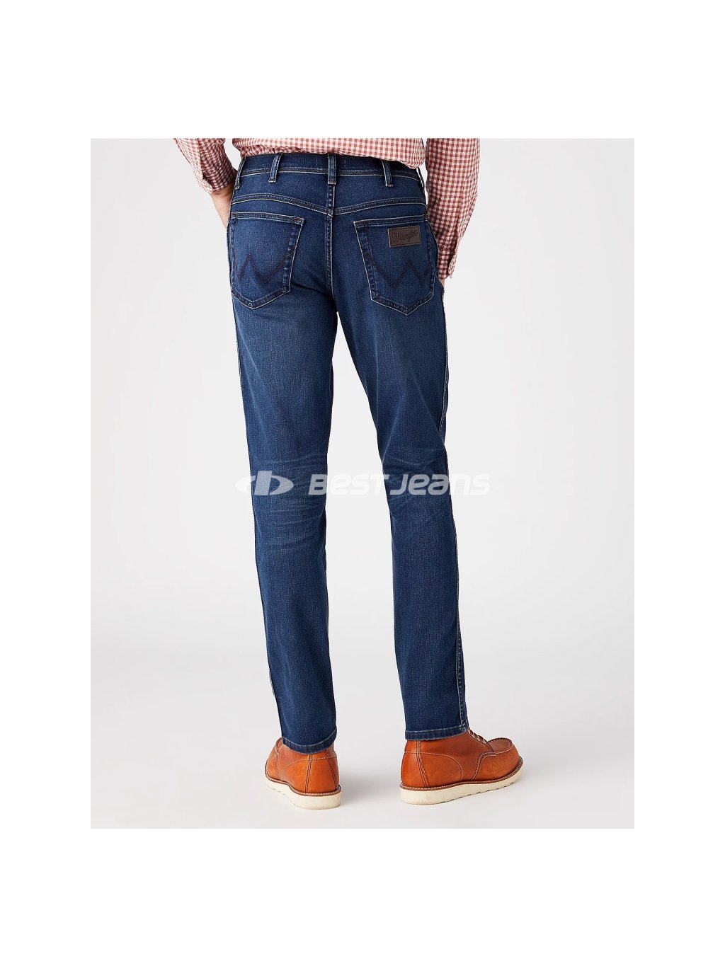 Moderní pěti kapsové džíny úzkého střihu TEXAS SLIM se středně vysokým sedem a mírně se zužujícími nohavicemi. Kalhoty jsou vyrobeny z příjemného velmi měkkého a pružného modrého denimu o nižší gramáži. Jsou prošity světle hnědou nití a mají mosazné nýty a knoflík. Na zadních kapsách jeans je ozdobné originální „W“ vyšívání, na pravé zadní kapse také kožená nášivka s logem Wrangler. Inovativní materiál Epic Soft znamená to nejvyšší pohodlí i při celodenním nošení.