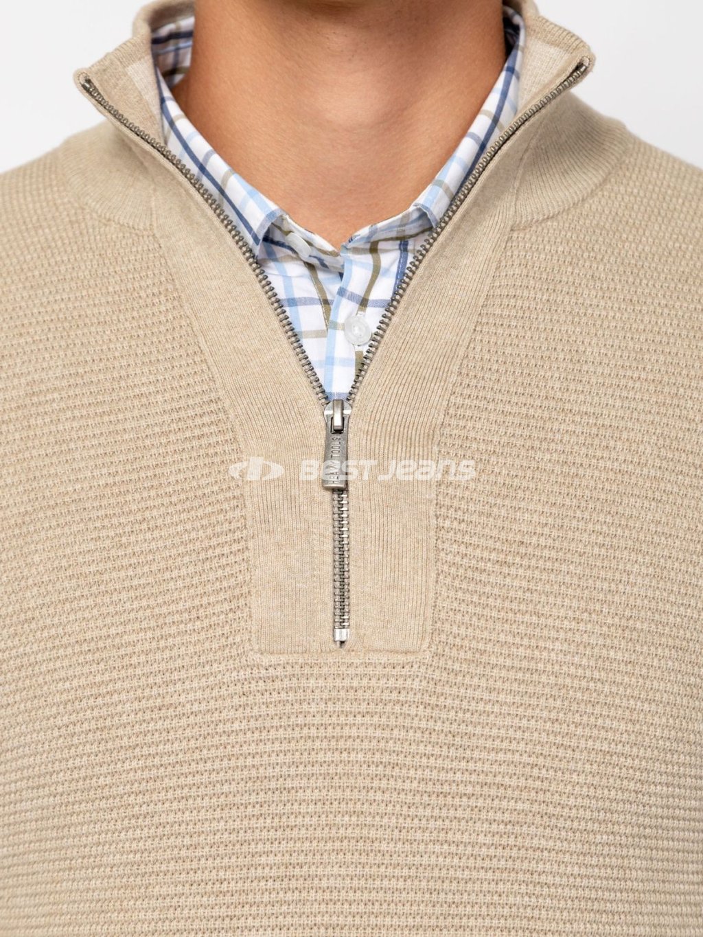 Pánský pletený polopropínací svetr Heavy Tools se stojáčkovým límcem a žebrovanými lemy kolem rukávů a na spodním okraji. Přední díl a horní část zadního dílu jemně strukturovaná, ostatní části hladké. Malý kožený štítek na spodní části vpředu.