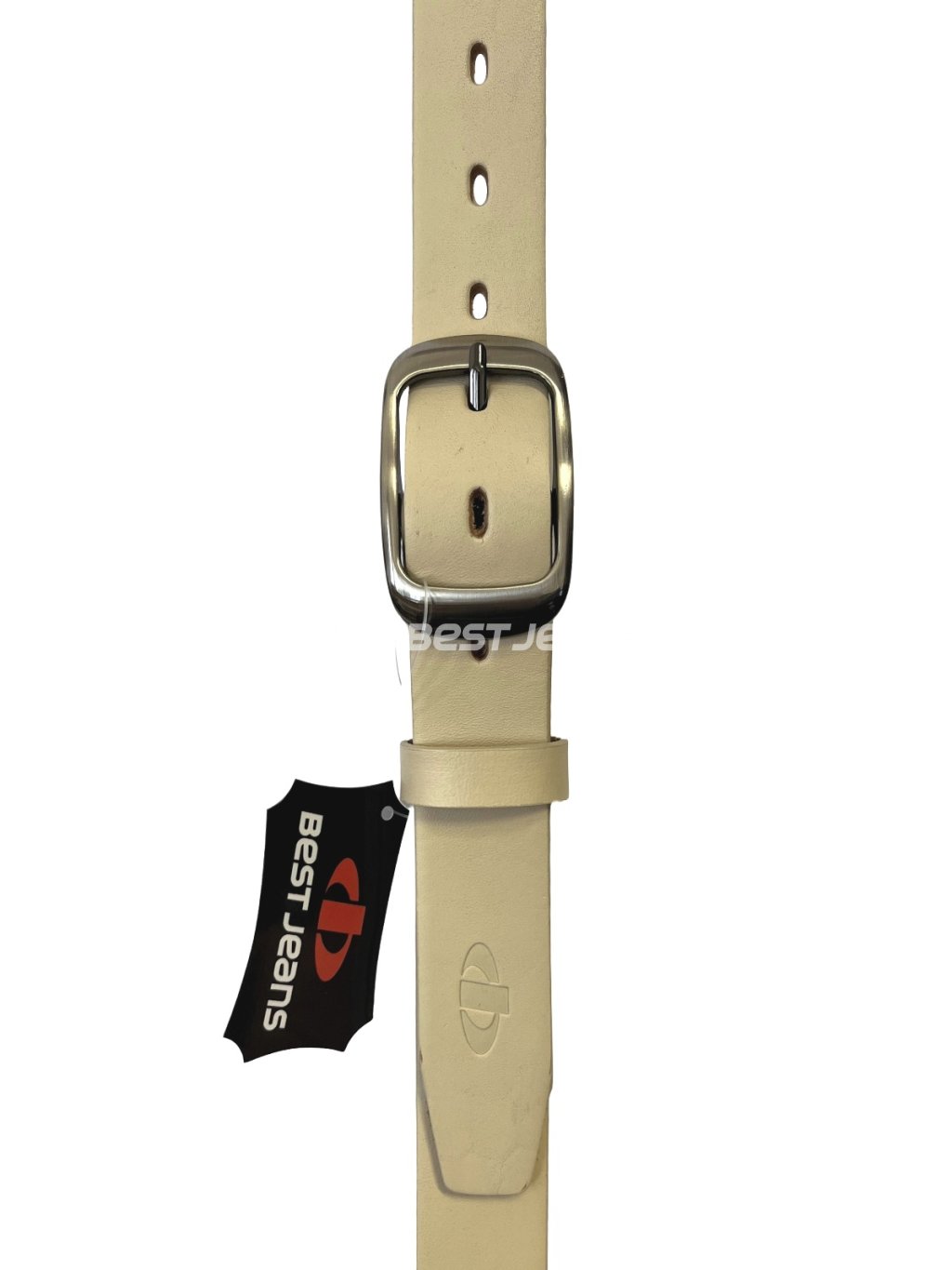 Prvotřídní dámský béžový kožený opasok s pěknou kovovou sponou s povrchovou úpravou nikl satinato (NKS) a vyraženým logem na špičce. Tato spona obsahuje nikl.