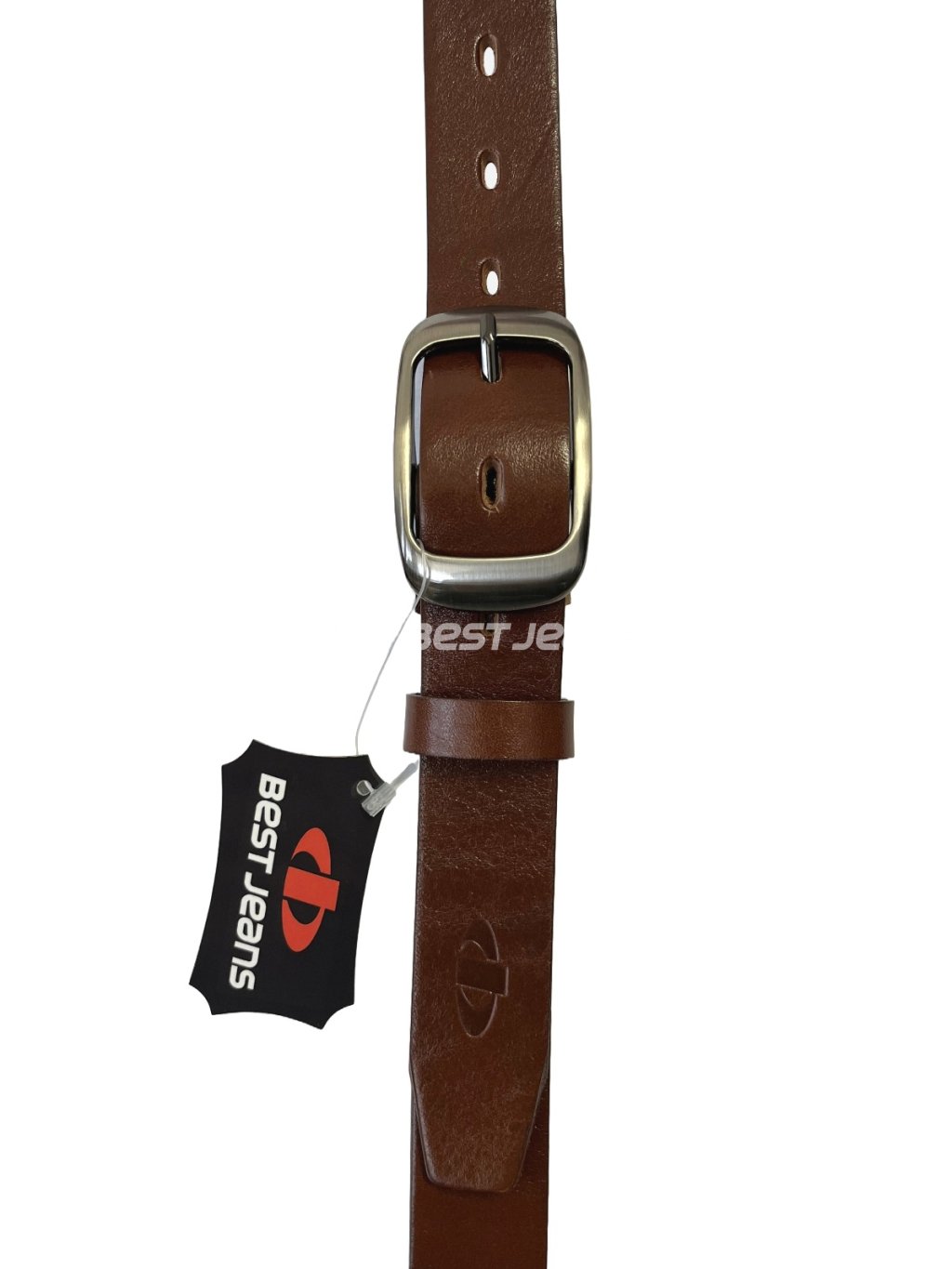 Prvotřídní dámský hnědý kožený opasok s pěknou kovovou sponou s povrchovou úpravou nikl satinato (NKS) a vyraženým logem na špičce. Tato spona obsahuje nikl.