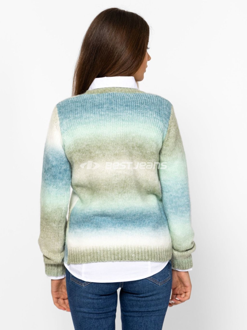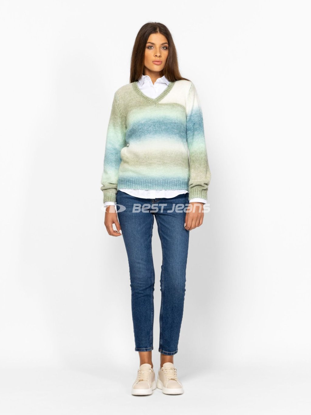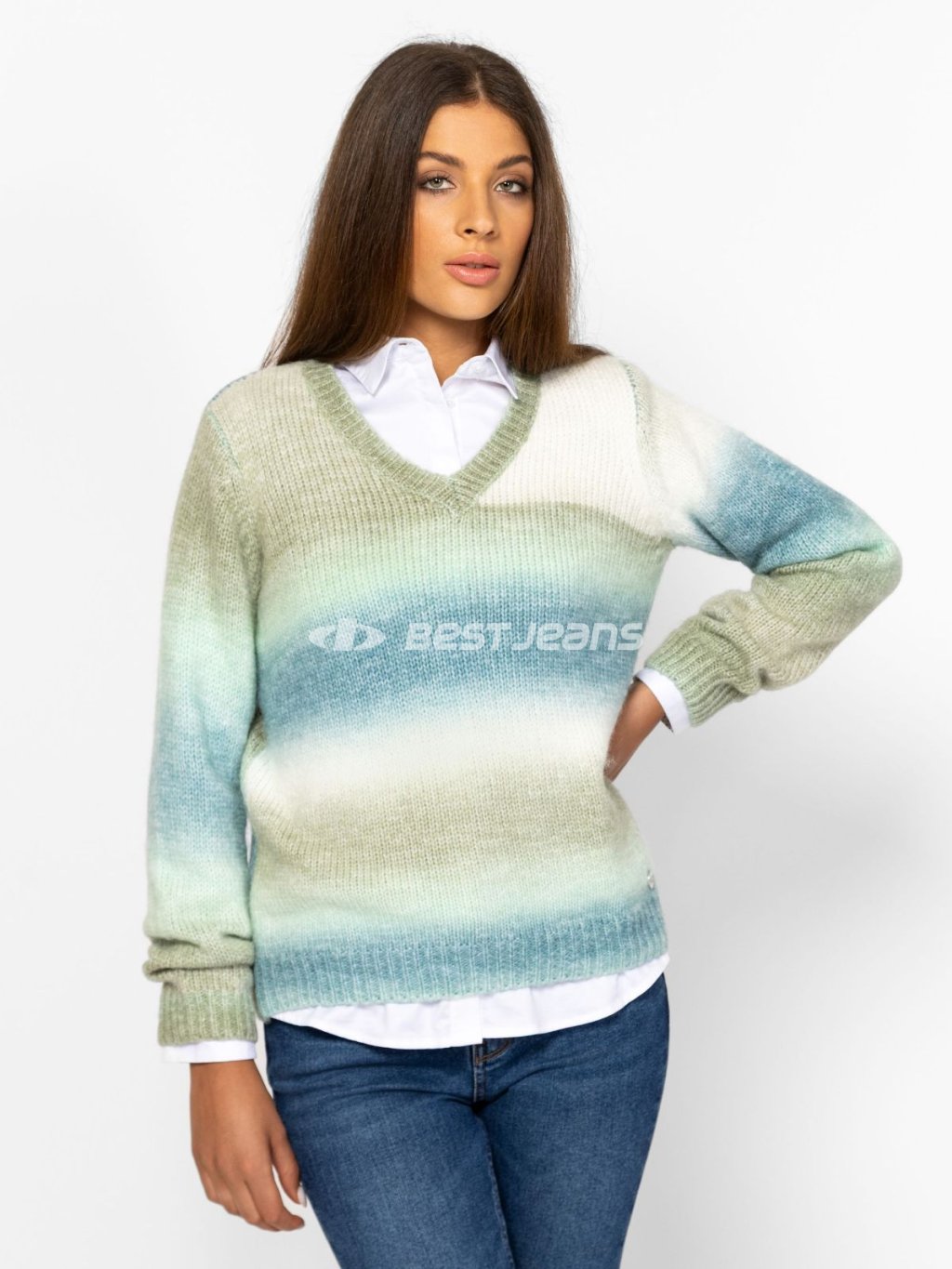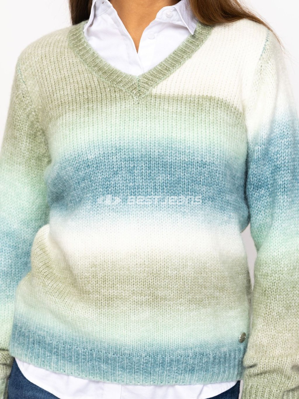Dámsky pletený sveter Heavy Tools rovného střihu s výstřihem do V. Malý kovový štítek s logem na spodní části, barevně blokovaný úplet.