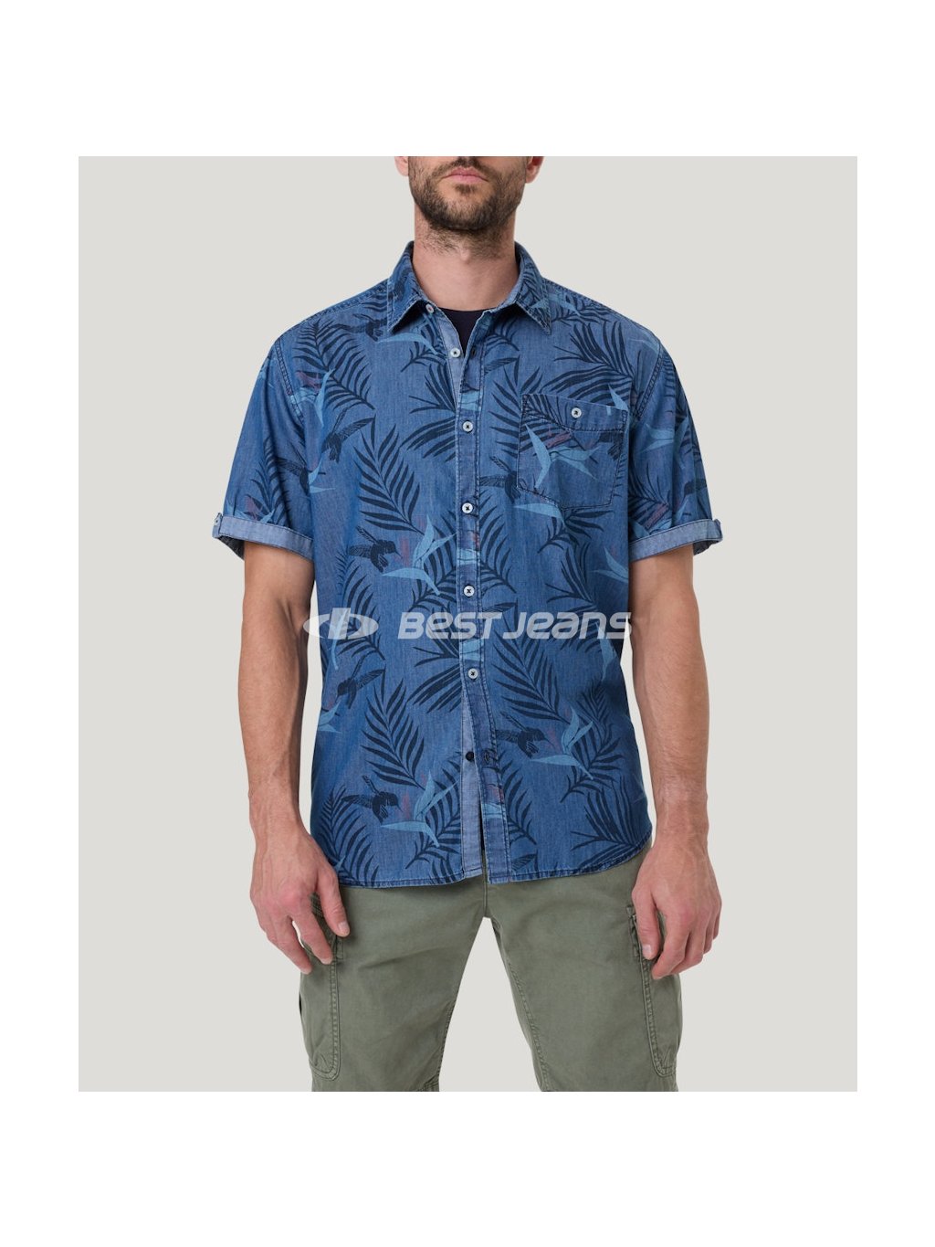 Lehká pánská košeľa Pioneer s krátkým rukávem z modré vzorované látky s jednou kapsičkou a zapínáním na knoflíky. Prošitá nití v tmavě modrém tónu.