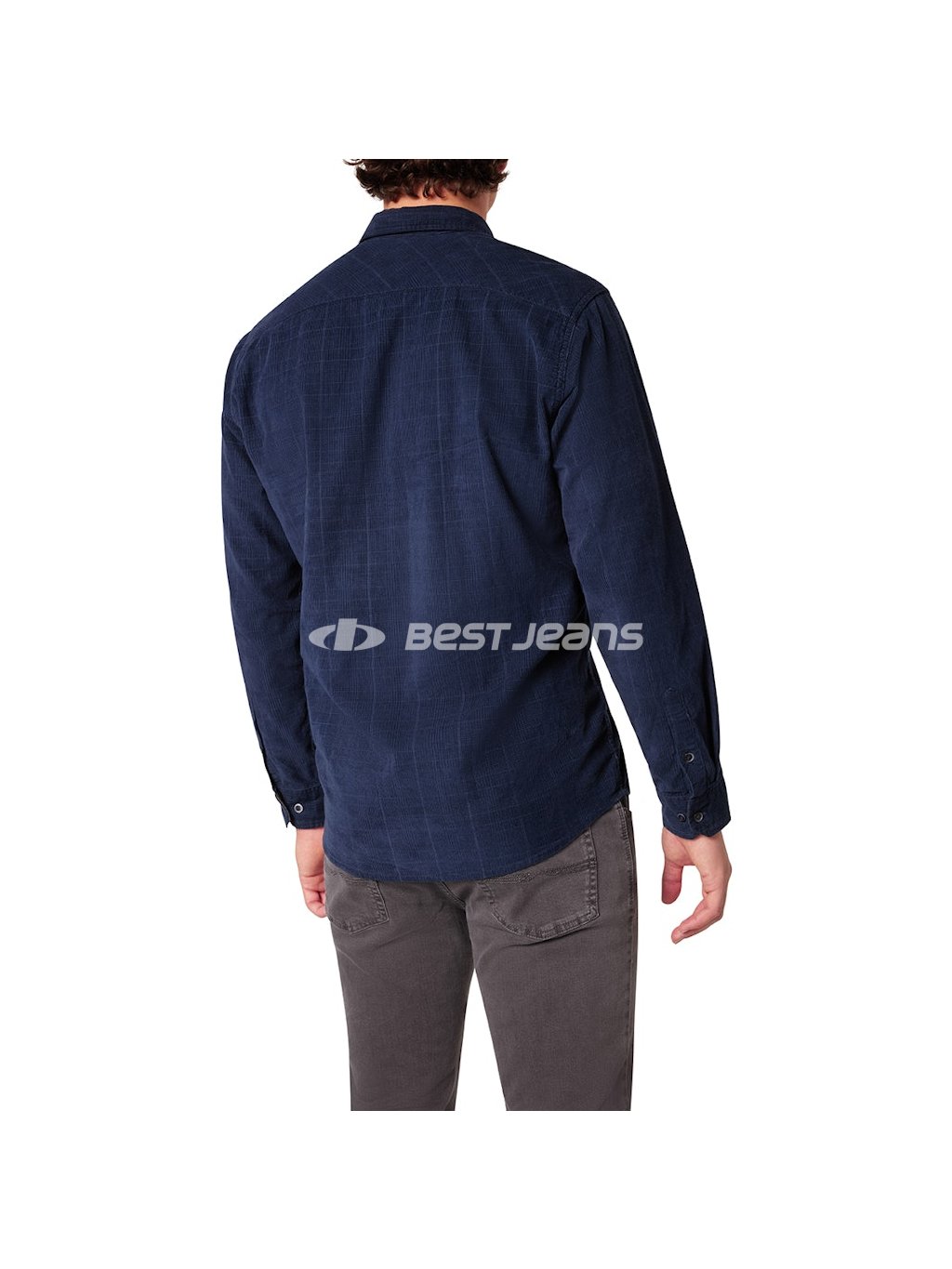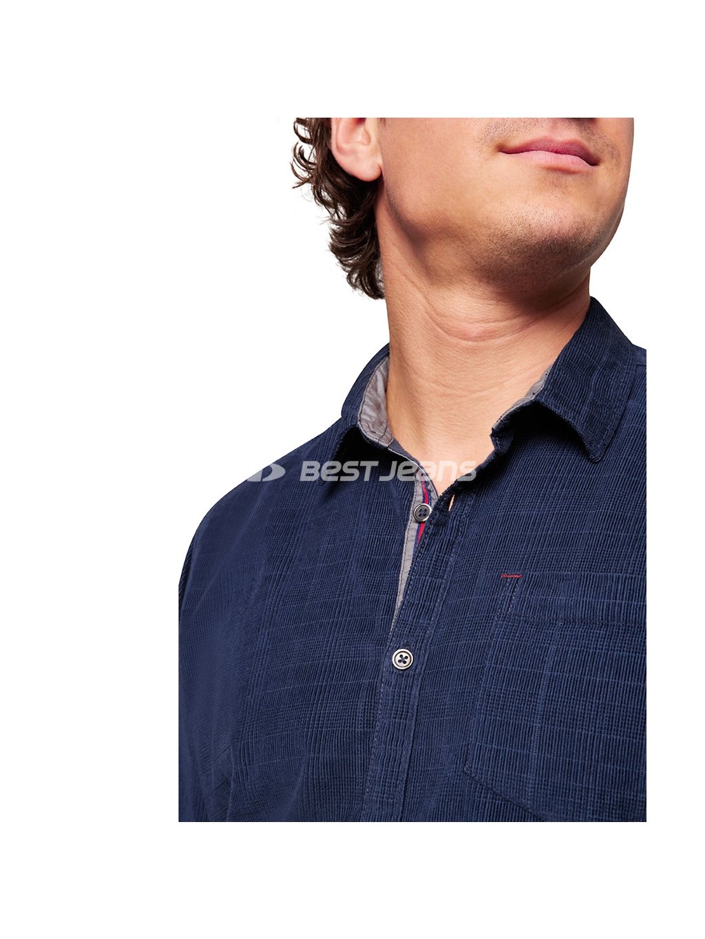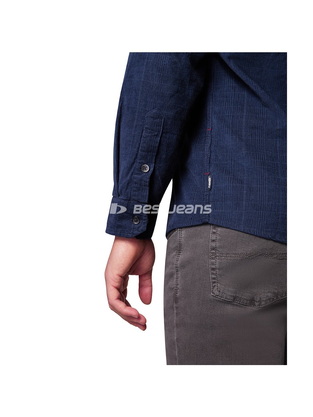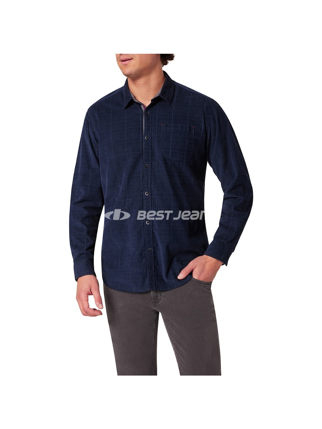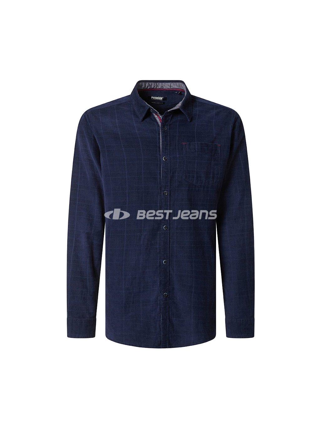 Pánska košeľa Pioneer z decentně kárované tmavě modré látky s jednou kapsičkou a zapínáním na knoflíky. Prošitá nití v tmavě modrém tónu.