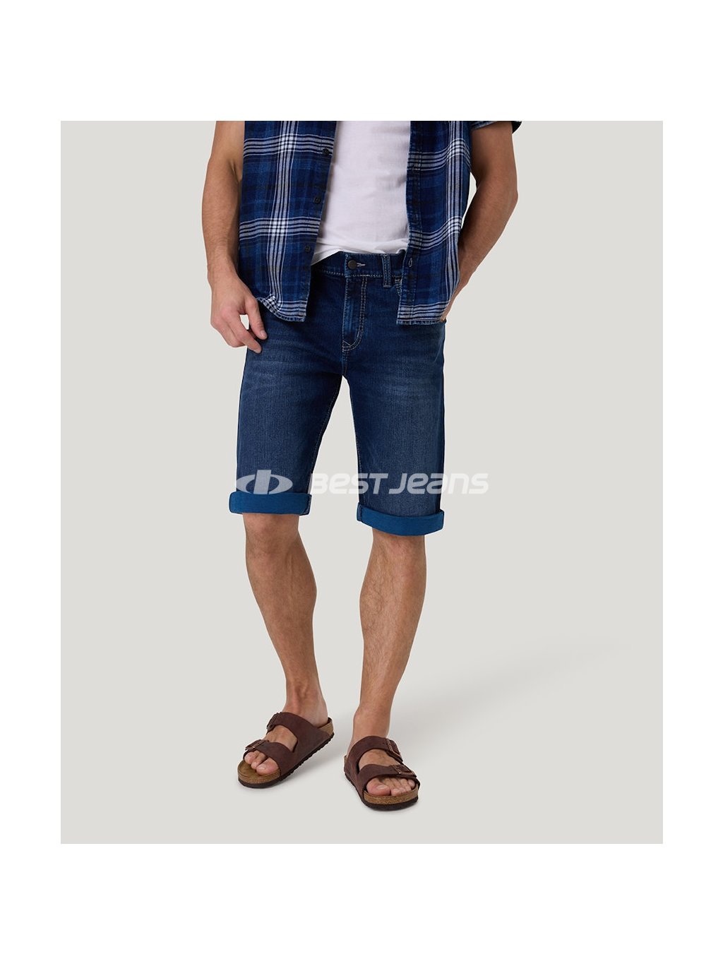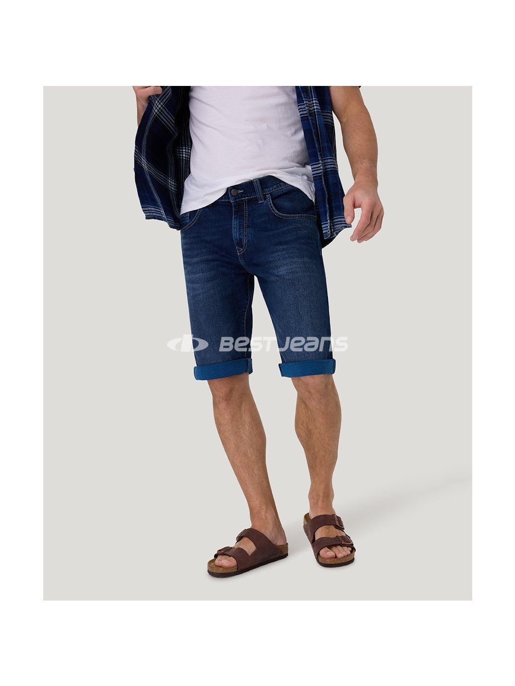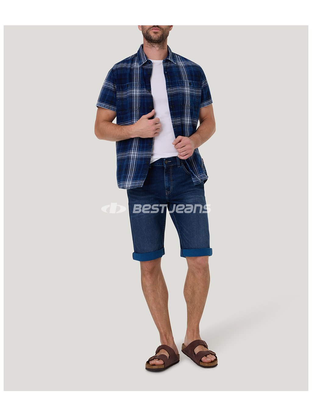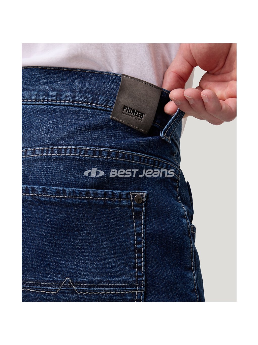 Klasické pánské pěti kapsové bermudy střihu ROUVEN se středním sedem, přičemž přední pozice je nižší než zadní. Jsou vyrobeny z tmavě modrého denimu MEGAFLEX s lehkým šoupáním a jsou prošity dvojitým stehem šedou nití včetně originálního ozdobného prošití zadních kapes. Mají mosazné nýty a knoflík s logem značky. Vzadu na pasu nechybí kožená nášivka PIONEER AUTHENTIC JEANS. Vhodné doplnit koženým opaskem.