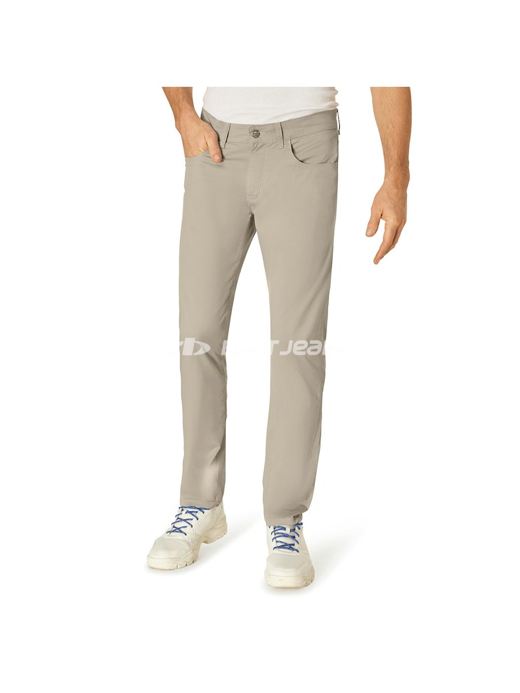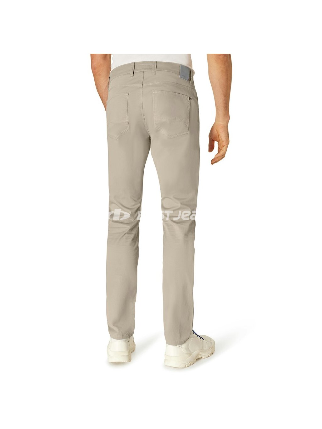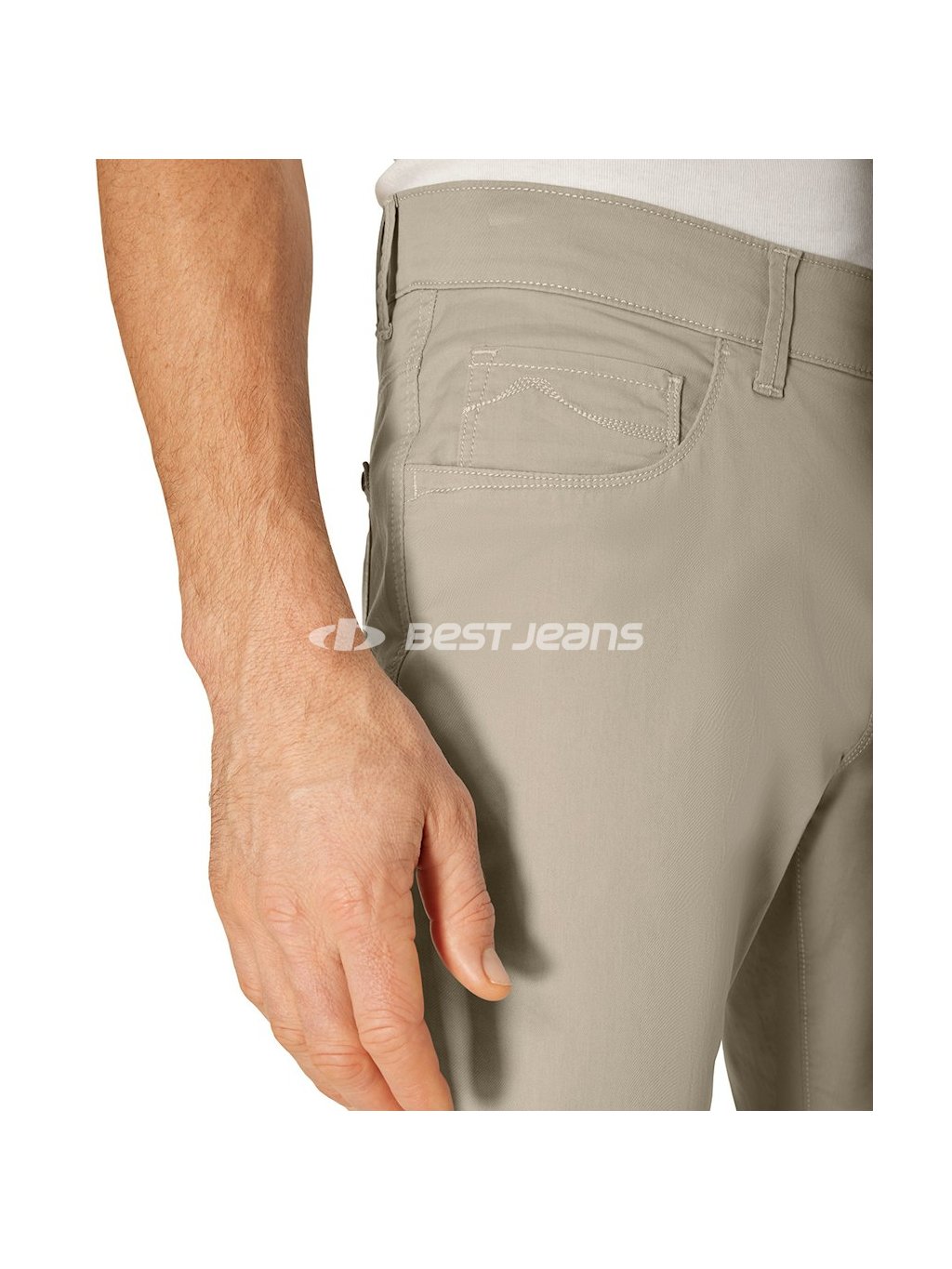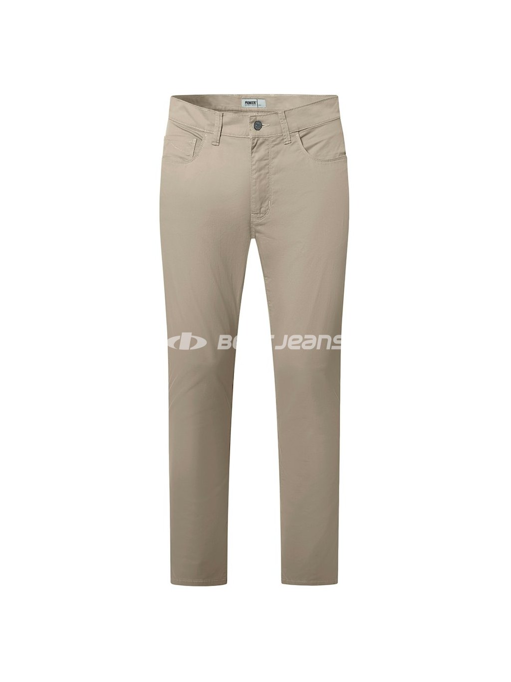 Elegantní lehké pánské pěti kapsové nohavice střihu ERIC s rovnými nohavicemi a středním sedem, přičemž přední pozice je nižší než zadní. Jsou vyrobeny z béžového plátna a prošity dvojitým stehem v béžovém tónu včetně originálního ozdobného prošití zadních kapes. Mají mosazné nýty a knoflík s logem značky. Vzadu na pasu nechybí nášivka PIONEER AUTHENTIC JEANS. Vhodné doplnit koženým opaskem. I v horkých letních dnech se v nich budete cítit velmi pohodlně.