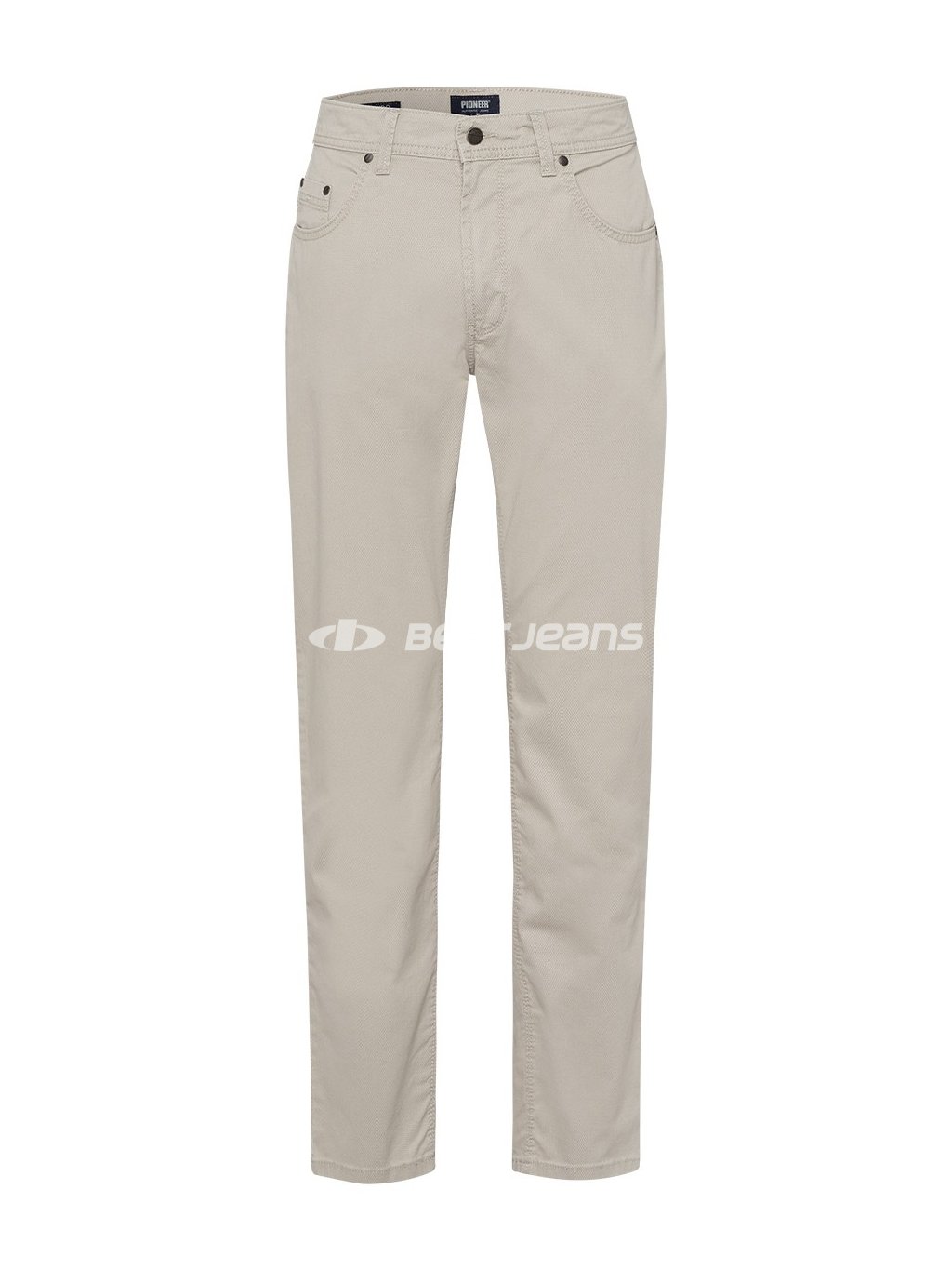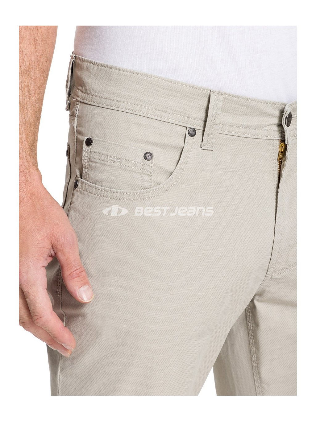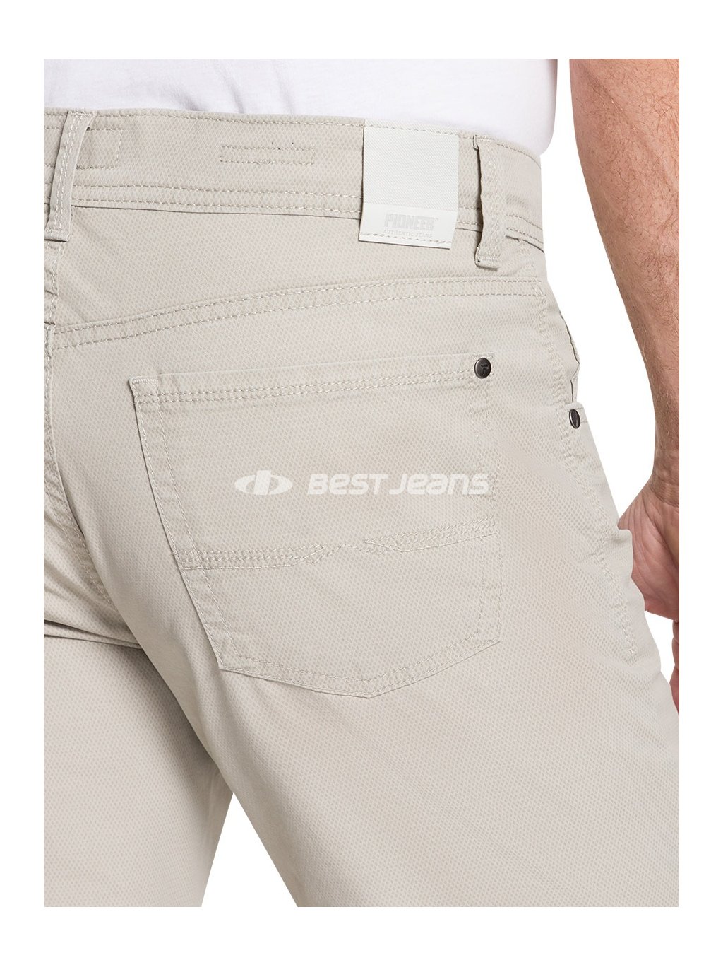 Elegantní lehké pánské nohavice klasického střihu RANDO se středním, vzadu mírně vyšším sedem a rovnými nohavicemi. Díky příměsi elastanu jsou pohodlné při nošení. Můžete je nosit i v horkých letních dnech. Jsou vyrobeny z příjemné béžové látky s nenápadným jemným vzorkem a prošity nití v béžovém tónu včetně originálního ozdobného prošití zadních kapes. Vzadu na pasu nechybí kožená nášivka PIONEER AUTHENTIC JEANS.