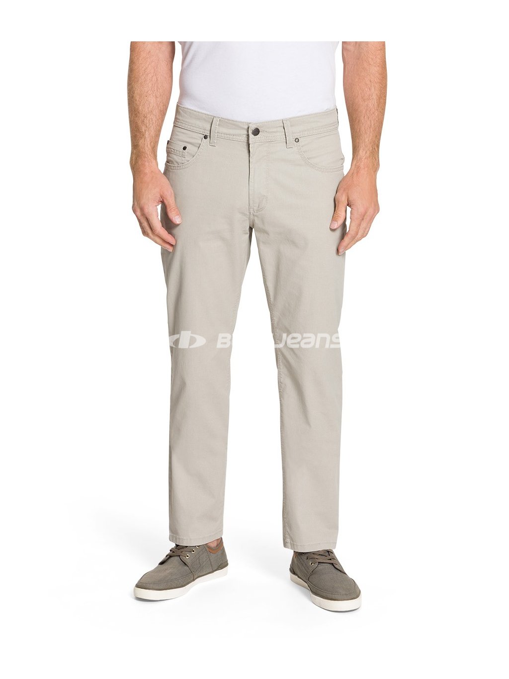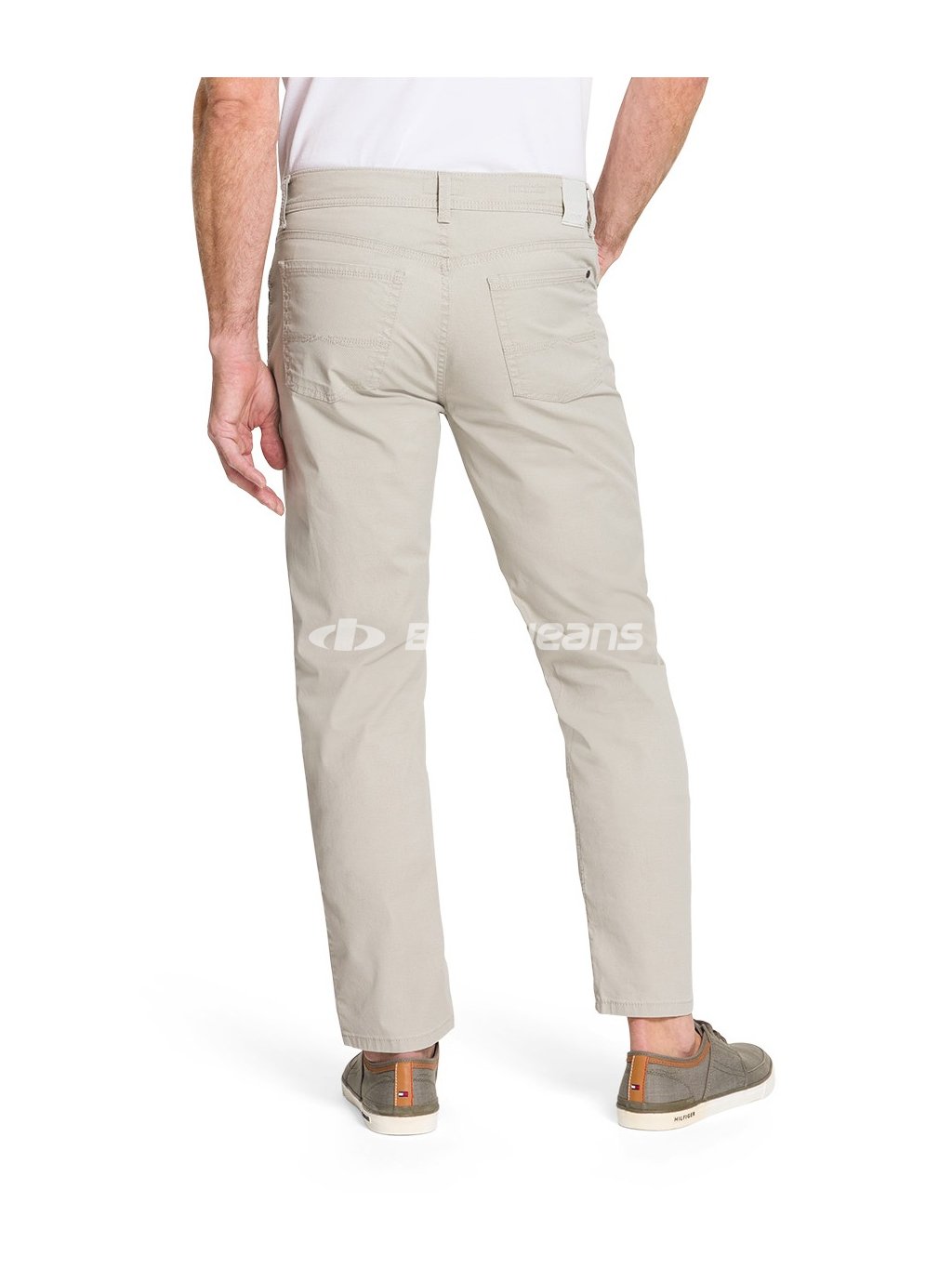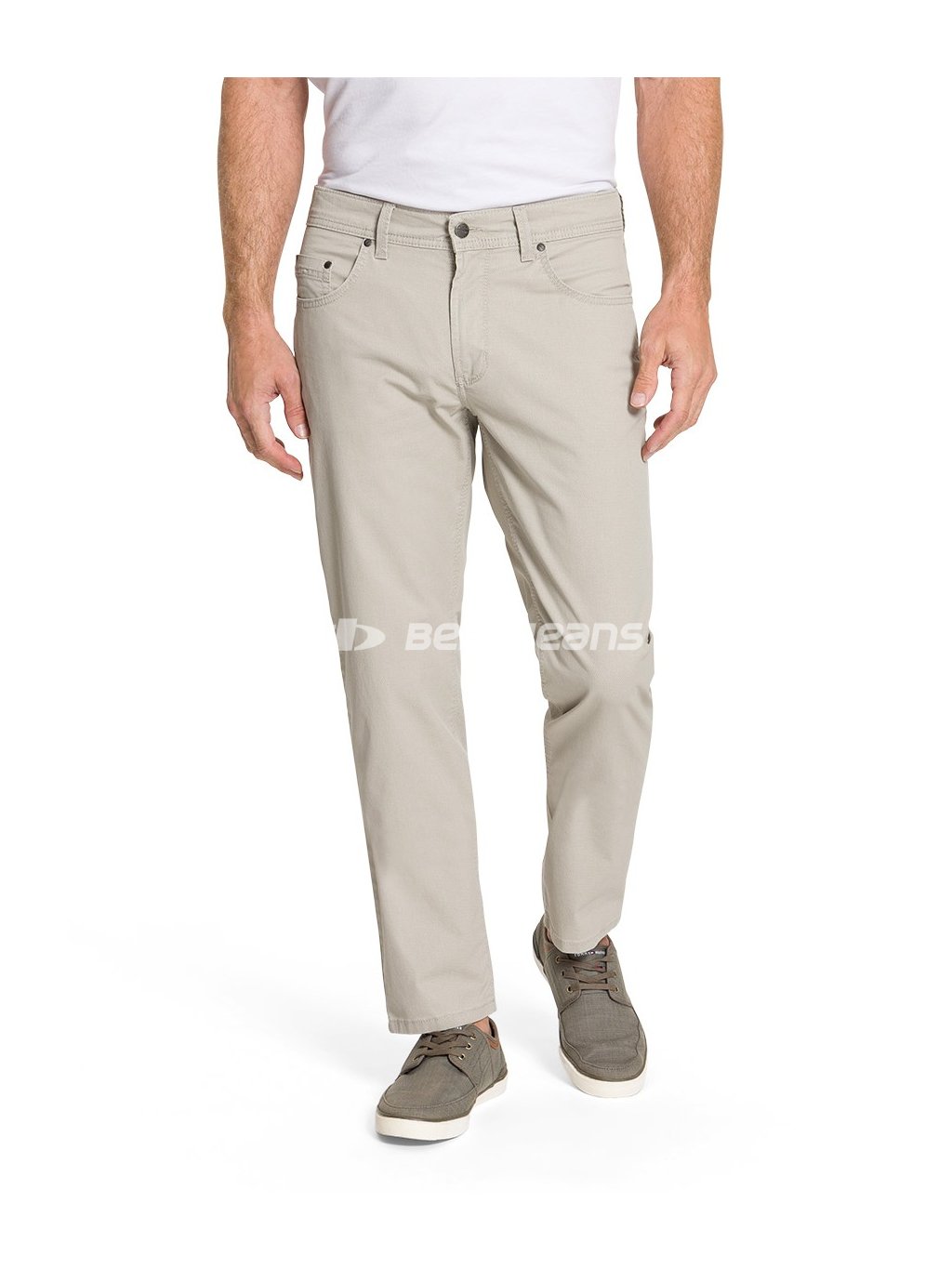 Elegantní lehké pánské nohavice klasického střihu RANDO se středním, vzadu mírně vyšším sedem a rovnými nohavicemi. Díky příměsi elastanu jsou pohodlné při nošení. Můžete je nosit i v horkých letních dnech. Jsou vyrobeny z příjemné béžové látky s nenápadným jemným vzorkem a prošity nití v béžovém tónu včetně originálního ozdobného prošití zadních kapes. Vzadu na pasu nechybí kožená nášivka PIONEER AUTHENTIC JEANS.