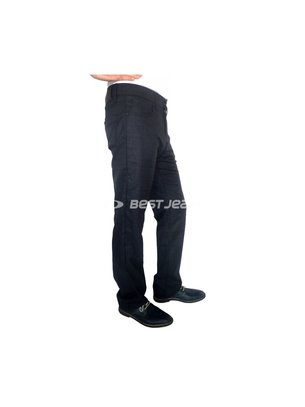 Elegantní pánské pěti kapsové nohavice Vigoss volného střihu se středně vysokým sedem a rovnými nohavicemi. Jsou vyrobeny z příjemného černého materiálu s decentním károvaným vzorem, díky širším nohavicím a také díky příměsi viskózy a elastanu jsou pohodlné při nošení. Jsou prošity dvojitým stehem v černém tónu včetně originálního ozdobného prošití zadních kapes a mají mosazné nýty a knoflík s vyraženým nápisem VIGOSS. Vzadu na pasu nechybí kožená nášivka s logem značky. Kalhoty se dobře kombinují jak se sportovním, tak i elegantnějším oblečením. Vhodné doplnit koženým opaskem.