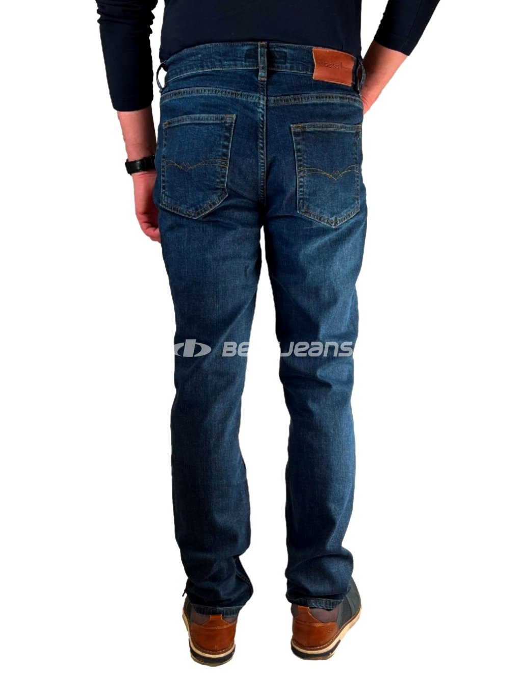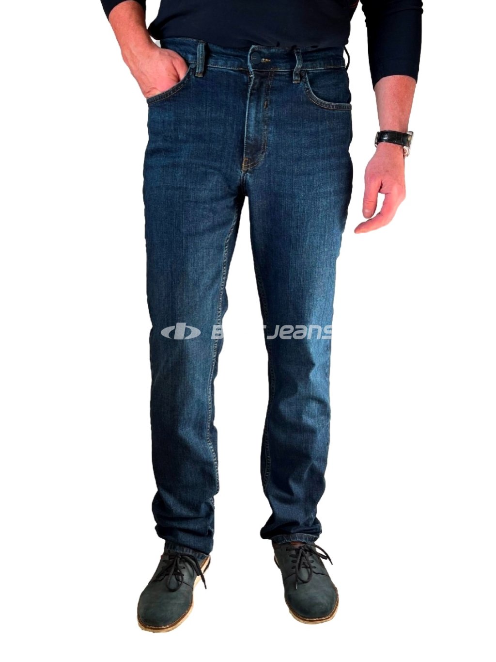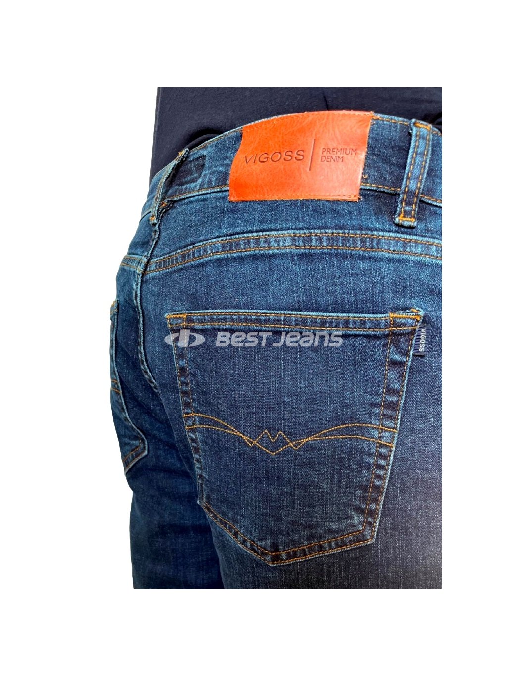 Klasické pánské pěti kapsové džínsy Vigoss s vysokým sedem a mírně se zužujícími nohavicemi. Rifle jsou vyrobeny z příjemného tmavě modrého denimu a mají lehké šoupání. Díky příměsi elastanu jsou pohodlné při nošení. Džínsy jsou prošity dvojitým žlutým stehem včetně originálního ozdobného prošití zadních kapes a mají mosazné nýty a knoflík s vyraženým nápisem VIGOSS. Vzadu na pasu nechybí kožená nášivka s logem značky. Vhodné doplnit koženým opaskem.