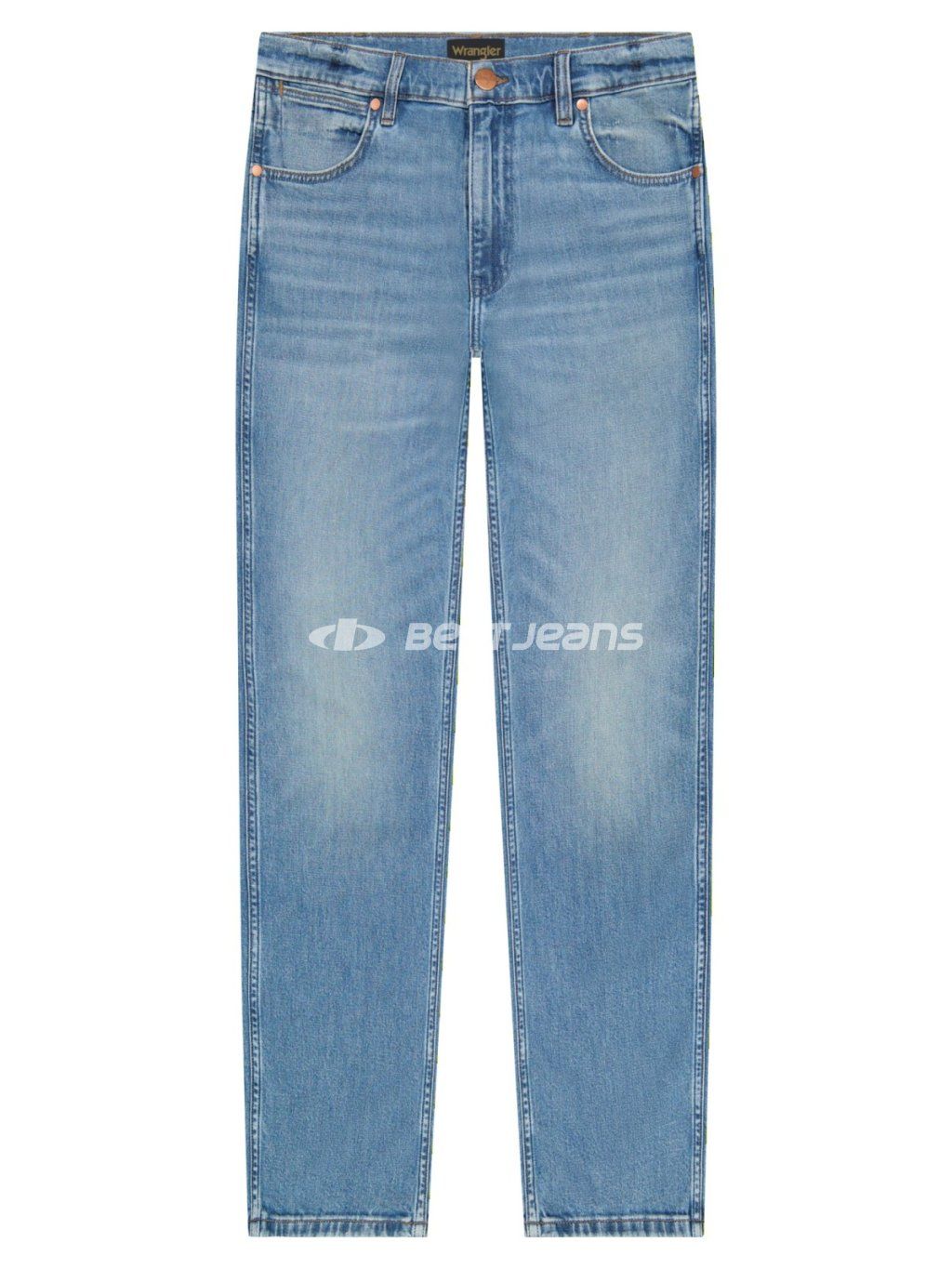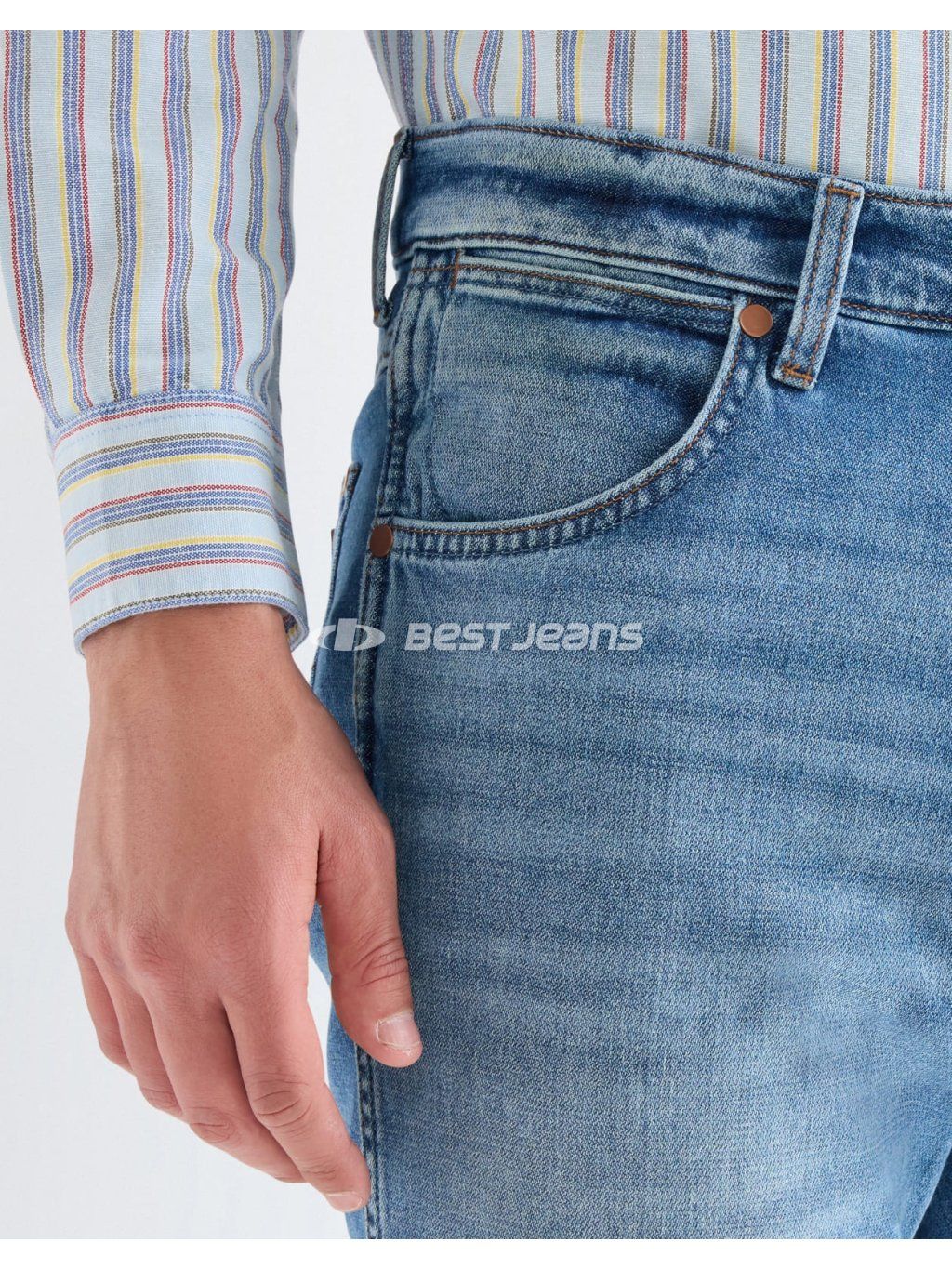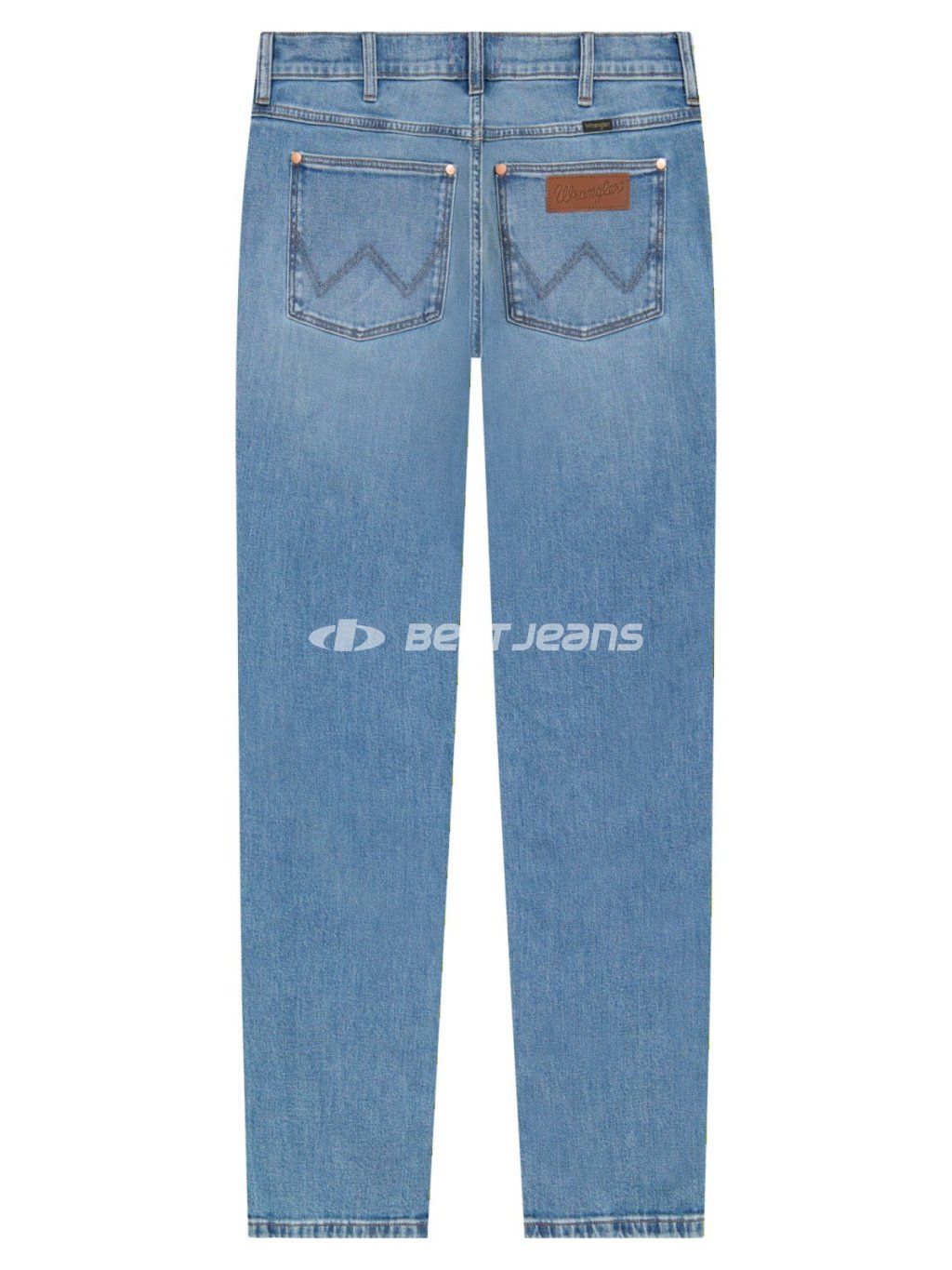 Klasické päť vreckové džínsy rovného strihu Greensboro so stredným, vpredu nízkym sedom a mierne sa zužujúcimi nohavicami. Nohavice sú vyrobené z príjemného svetlo modrého denimu s nižšou gramážou. Sú prešité svetlo hnedou niťou a majú mosadzné nity a gombík. Na zadných vreckách jeans je ozdobné originálne „W“ vyšívanie, na pravom zadnom vrecku tiež kožená nášivka s logom Wrangler. Inovatívny materiál Toughlite je skutočne odolný a zároveň ľahký a príjemný.