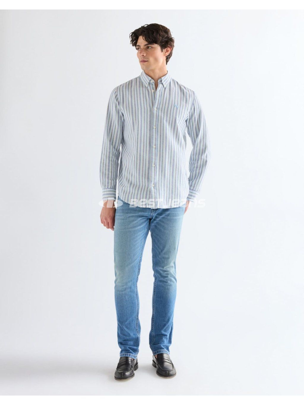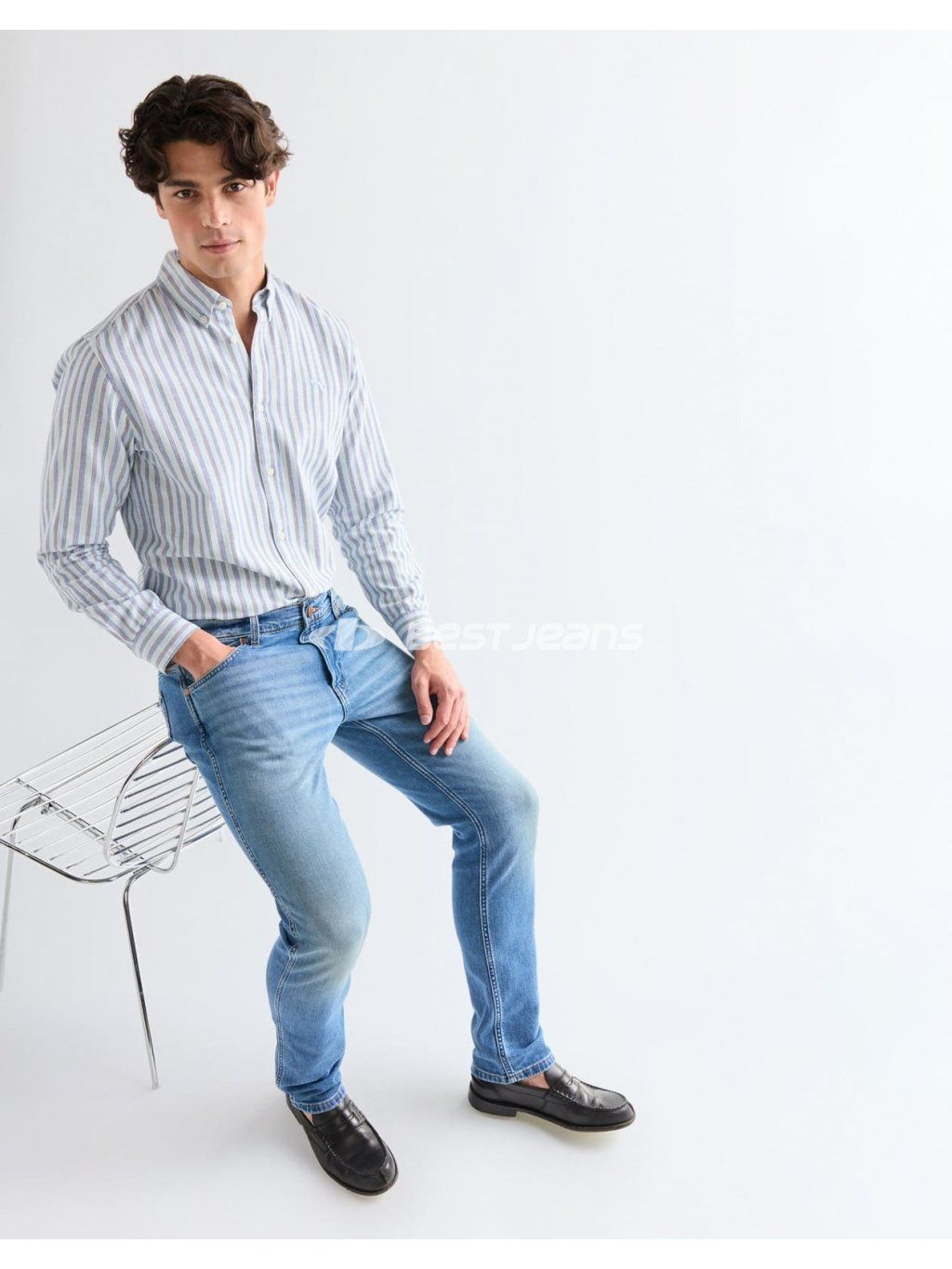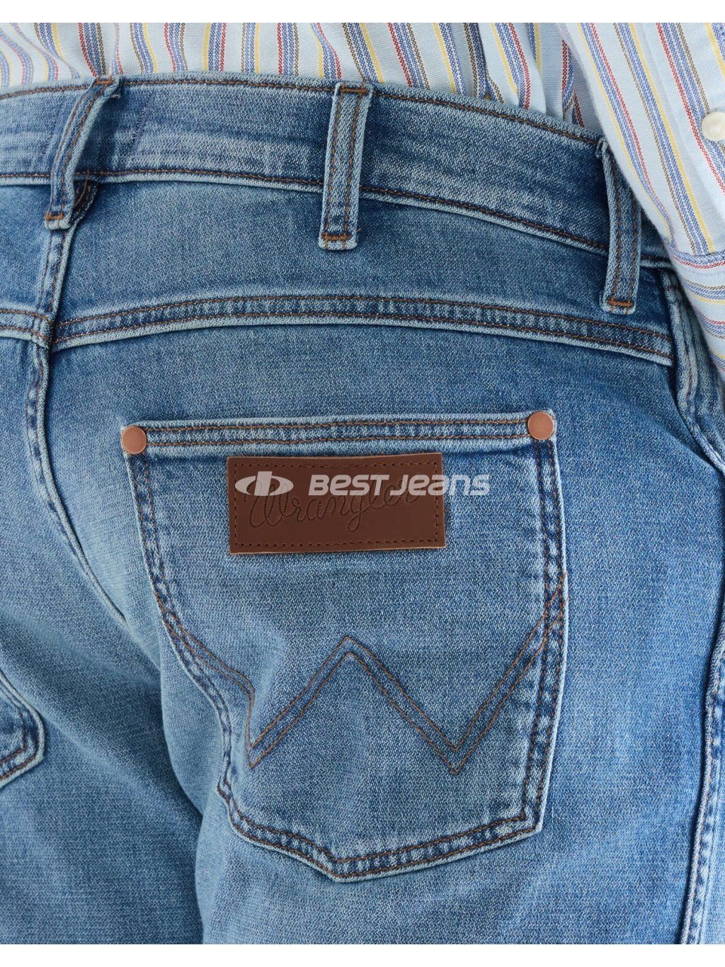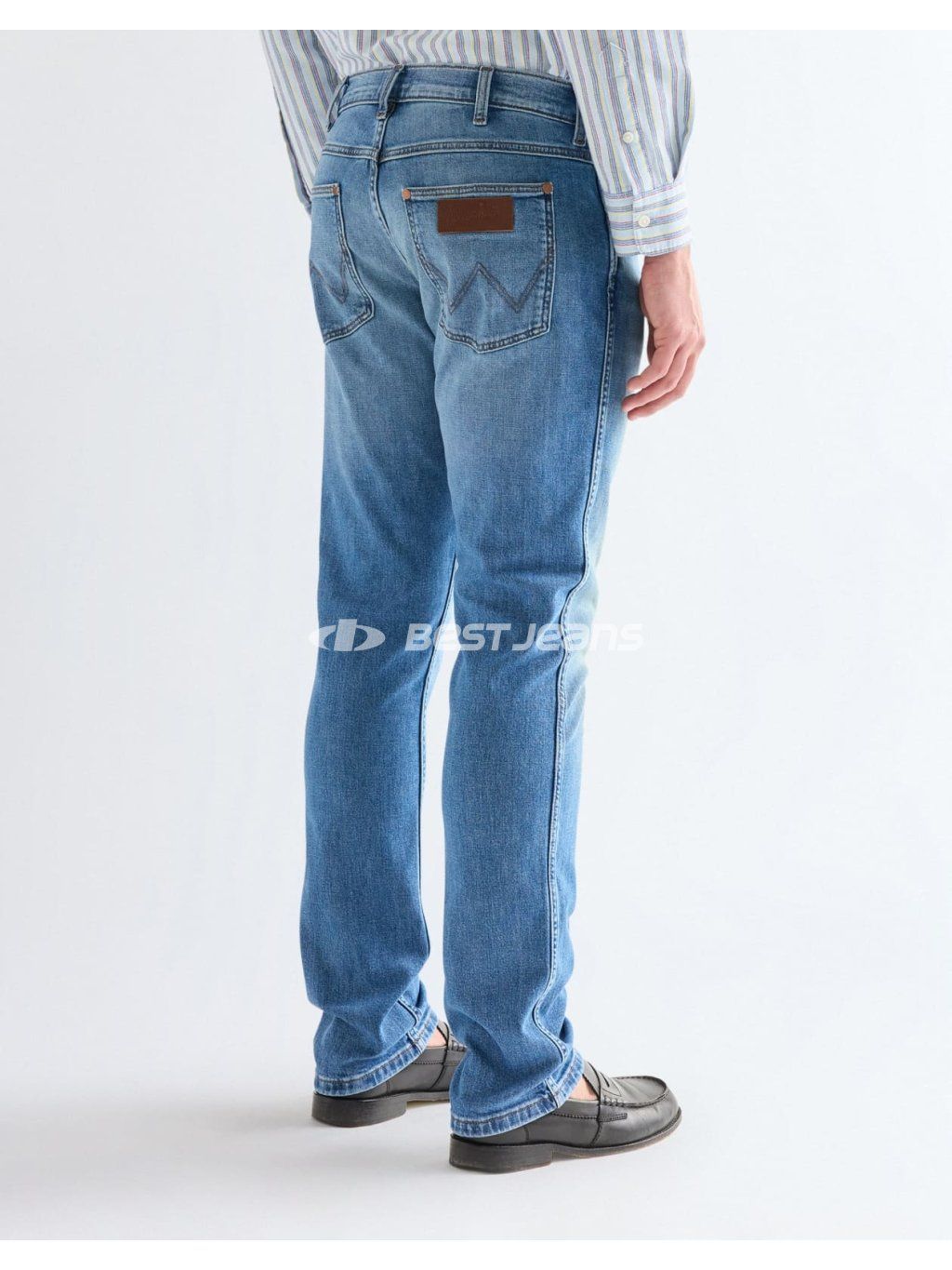 Klasické päť vreckové džínsy rovného strihu Greensboro so stredným, vpredu nízkym sedom a mierne sa zužujúcimi nohavicami. Nohavice sú vyrobené z príjemného svetlo modrého denimu s nižšou gramážou. Sú prešité svetlo hnedou niťou a majú mosadzné nity a gombík. Na zadných vreckách jeans je ozdobné originálne „W“ vyšívanie, na pravom zadnom vrecku tiež kožená nášivka s logom Wrangler. Inovatívny materiál Toughlite je skutočne odolný a zároveň ľahký a príjemný.