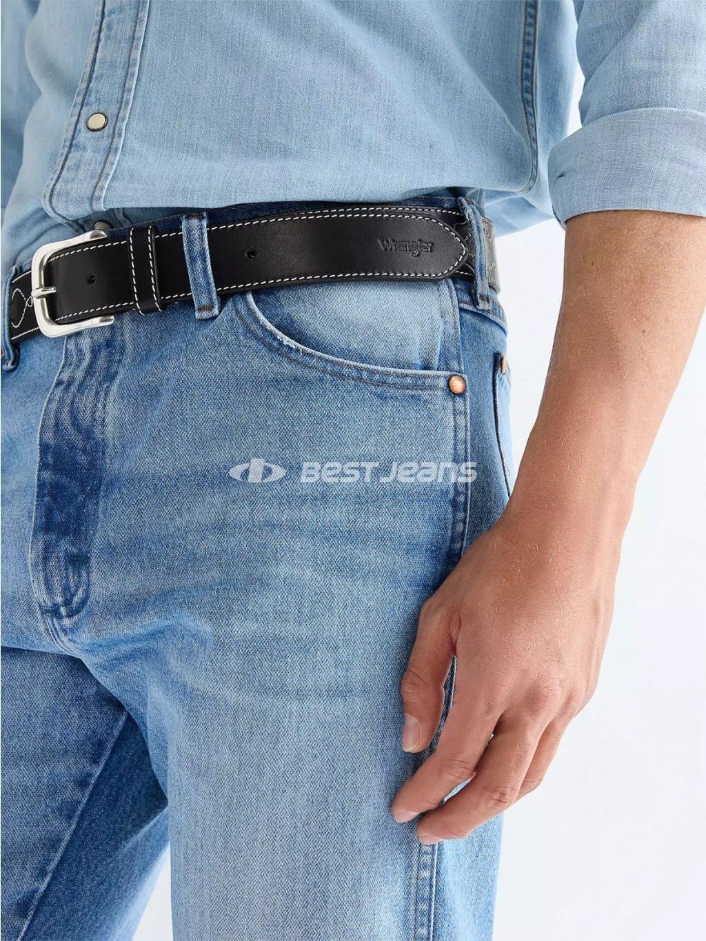 Pánsky čierny kožený opasok vo westernovom štýle ozdobne prešívaný šedou niťou. Zapínanie s oblou kovovou sponou a pevným pútkom, na špici vyrazené logo Wrangler. Je vyrobený z celozrnnej hovädzej kože, ktorej charakteristikou je najvyššia ušľachtilosť, pevnosť a unikátny prírodný vzhľad. Anilínová povrchová úprava dodáva koži jemnosť.