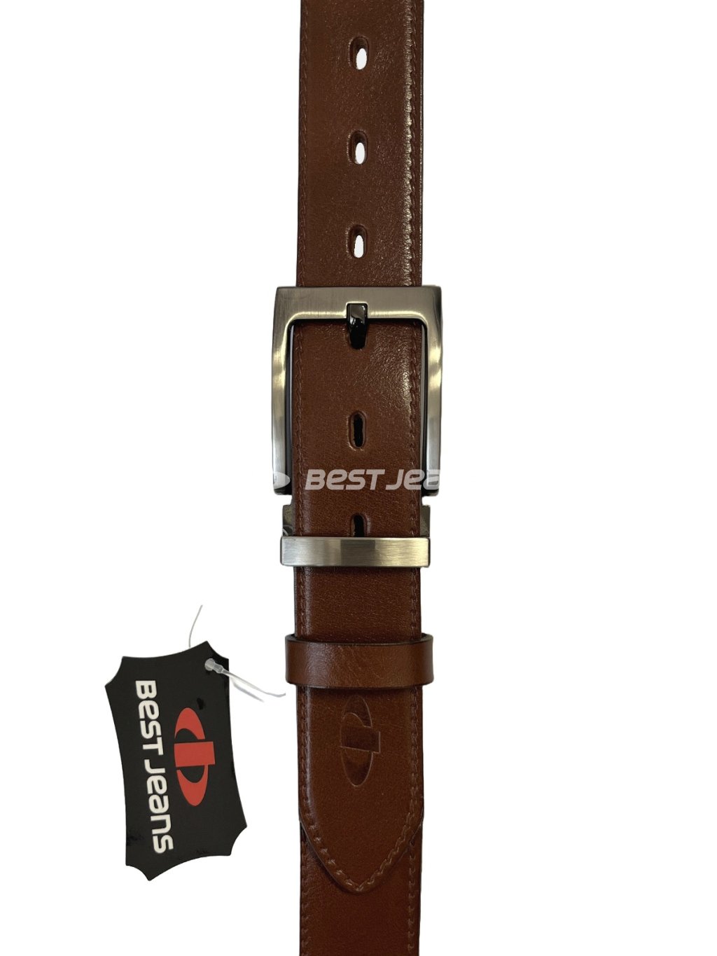 Prvotřídní pánský světle hnědý kožený spoločenský opasok s klasickou kovovou sponou s povrchovou úpravou nikl satinato (NKS) s kovovým poutkem a vyraženým logem na špičce. Je zdoben ražbou imitující prošití. Spona obsahuje nikl.